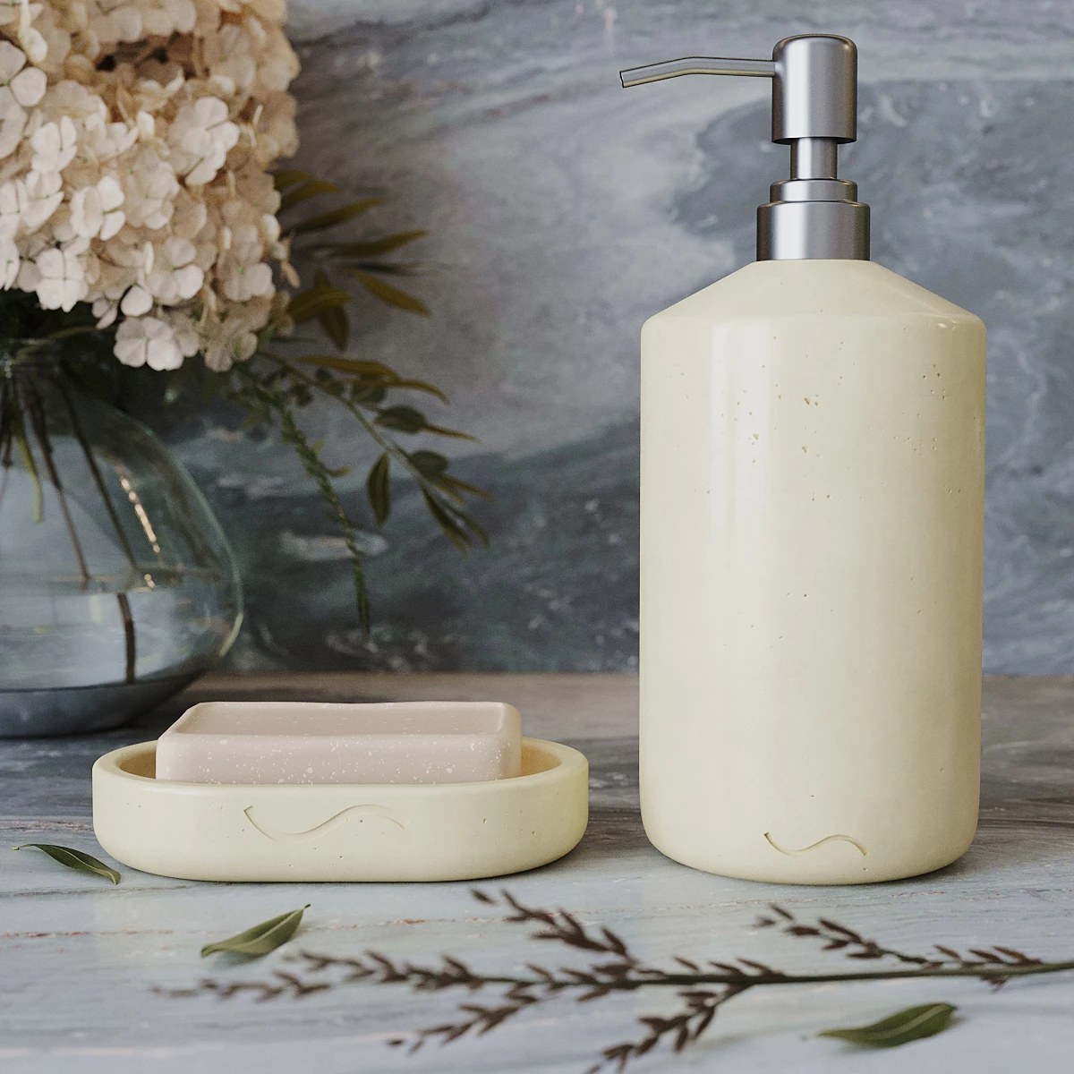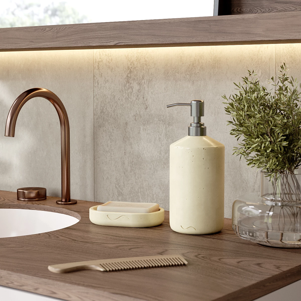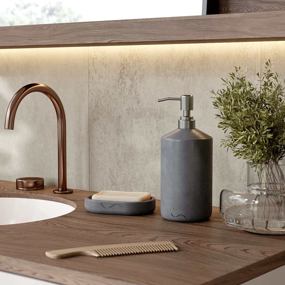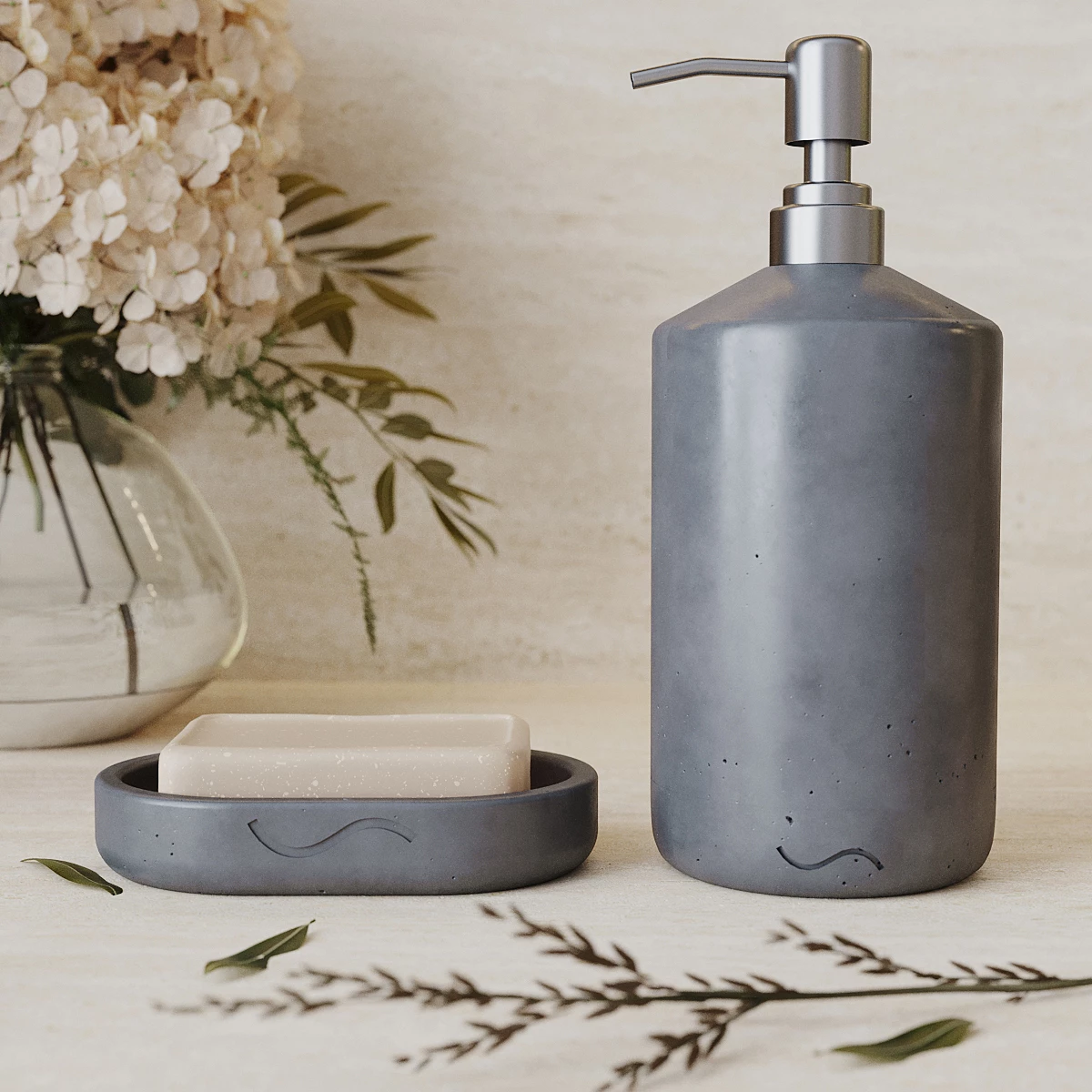 Лаконичный и стильный набор аксессуаров для ванной комнаты, изготовленный вручную из архитектурного бетона. Дозатор для жидкого мыла и мыльница станут украшением вашей ванной и помогут организовать пространство.