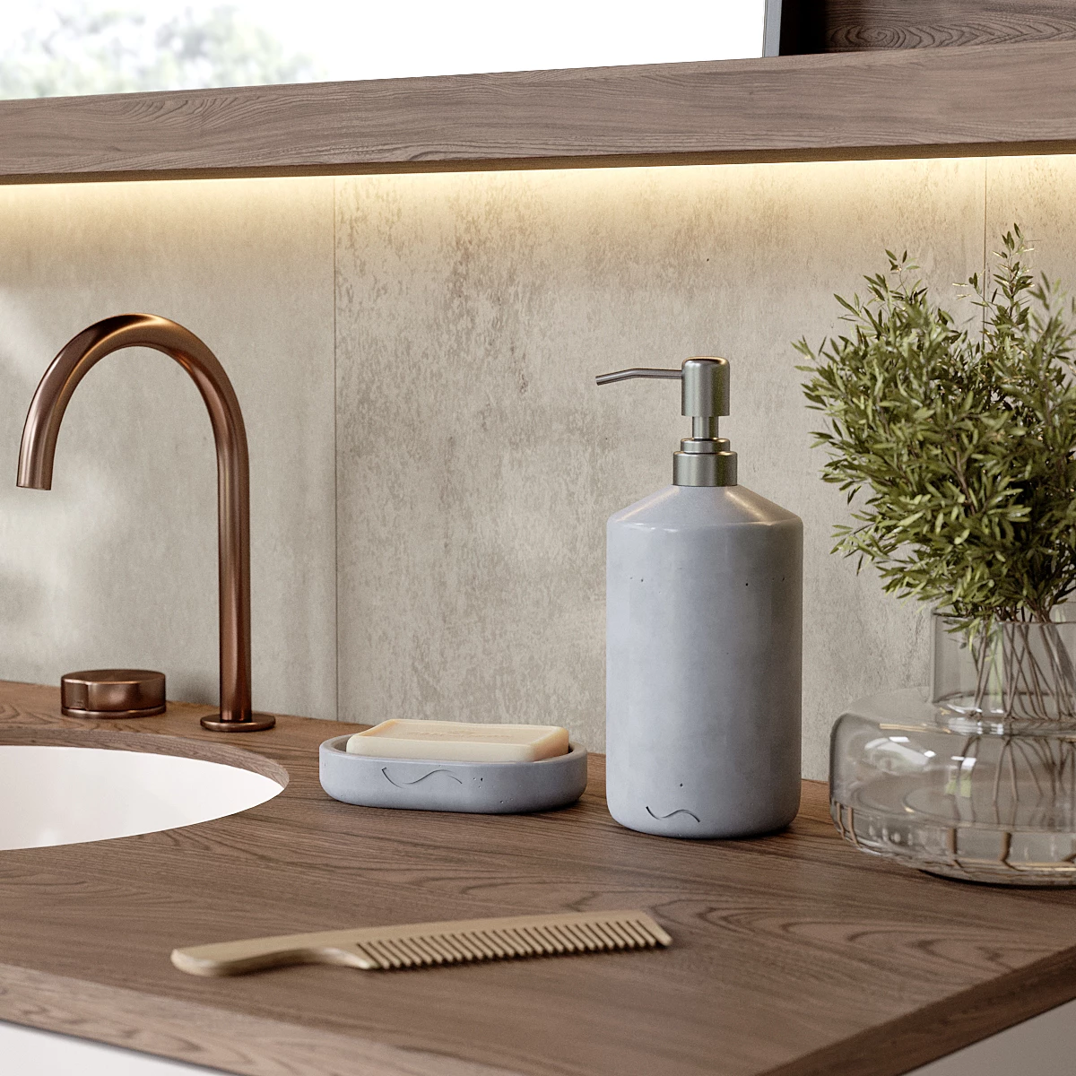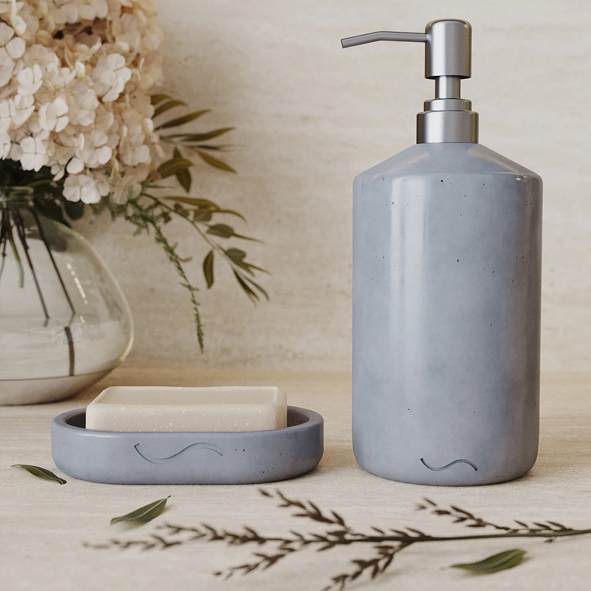 Лаконичный и стильный набор аксессуаров для ванной комнаты, изготовленный вручную из архитектурного бетона. Дозатор для жидкого мыла и мыльница станут украшением вашей ванной и помогут организовать пространство.