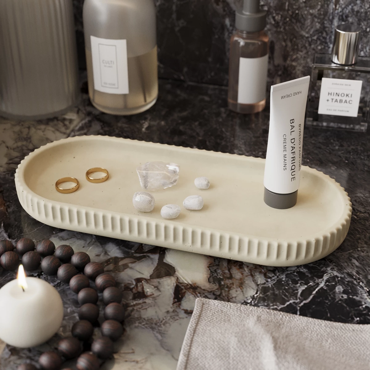 Chloe S - универсальный поднос для ванной, изготовленный вручную из особо прочного бетона. Имеет удобные бортики. Поднос отлично подходит для хранения украшений, в качестве подставки для свечей, аксессуаров для ванной и прочих мелочей. Изделие обработано специальной матовой пропиткой, защищающей от воды и грязи.