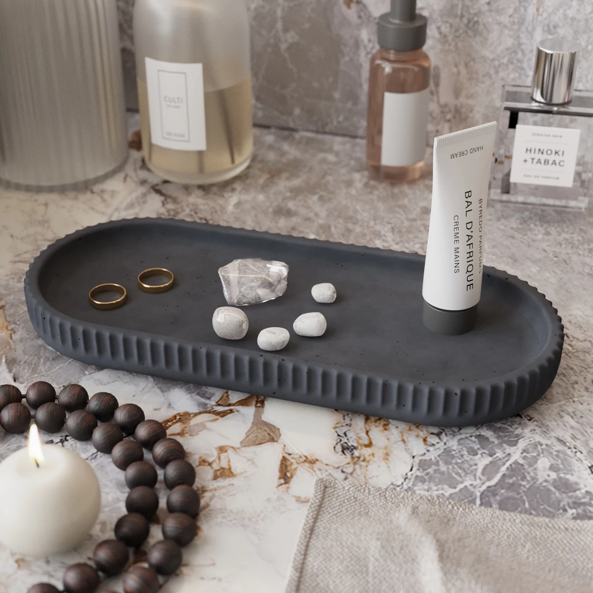 Chloe S - универсальный поднос для ванной, изготовленный вручную из особо прочного бетона. Имеет удобные бортики. Поднос отлично подходит для хранения украшений, в качестве подставки для свечей, аксессуаров для ванной и прочих мелочей. Изделие обработано специальной матовой пропиткой, защищающей от воды и грязи.