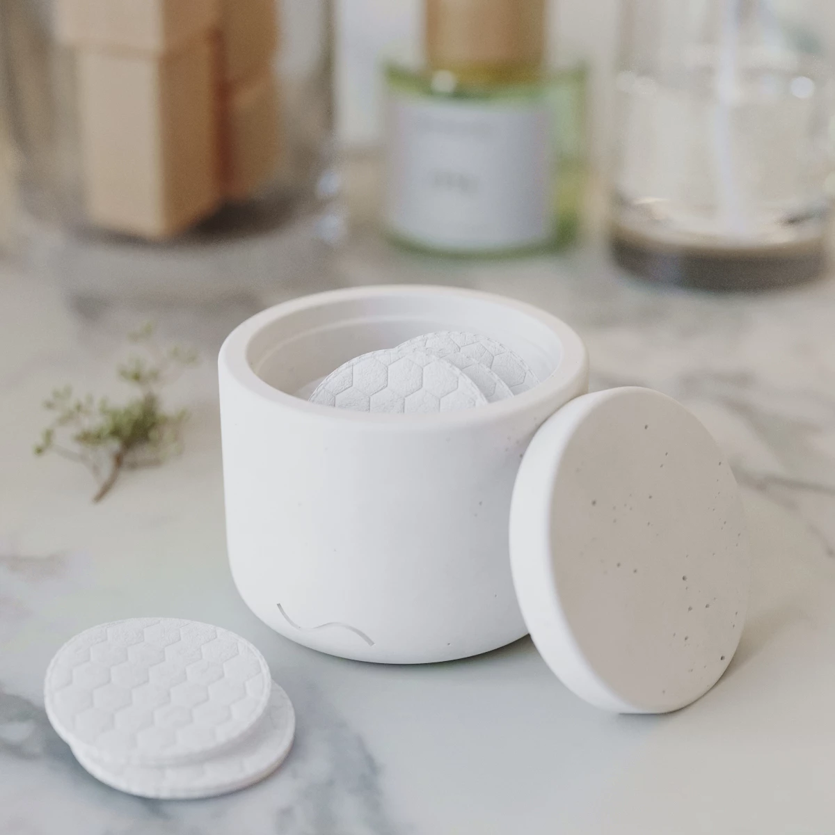 Декоративная подставка с крышкой Astrid для ватных дисков - это лаконичный и стильный интерьерный аксессуар, изготовленный вручную из архитектурного бетона.