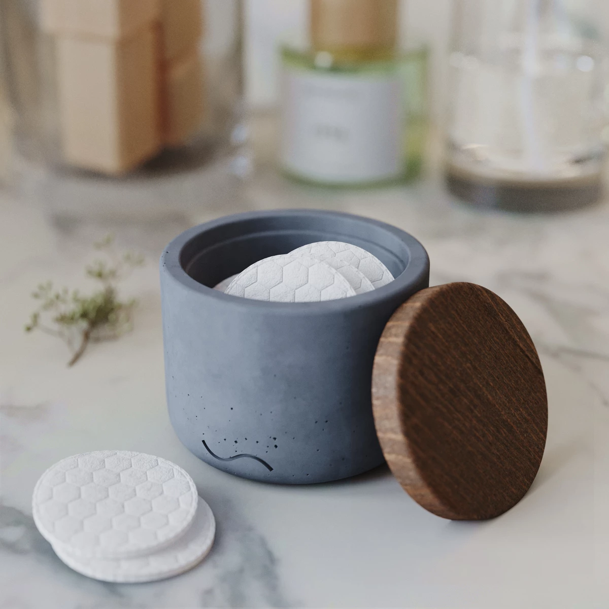Декоративная подставка с крышкой из натурального бука Astrid для ватных дисков - это лаконичный и стильный интерьерный аксессуар, изготовленный вручную из архитектурного бетона.