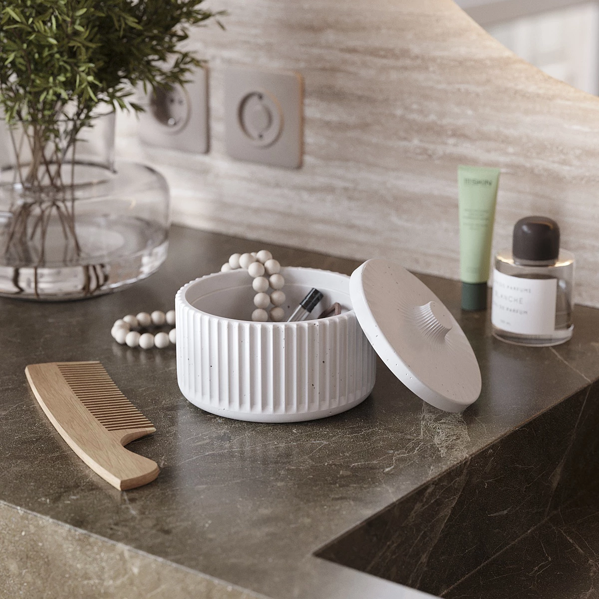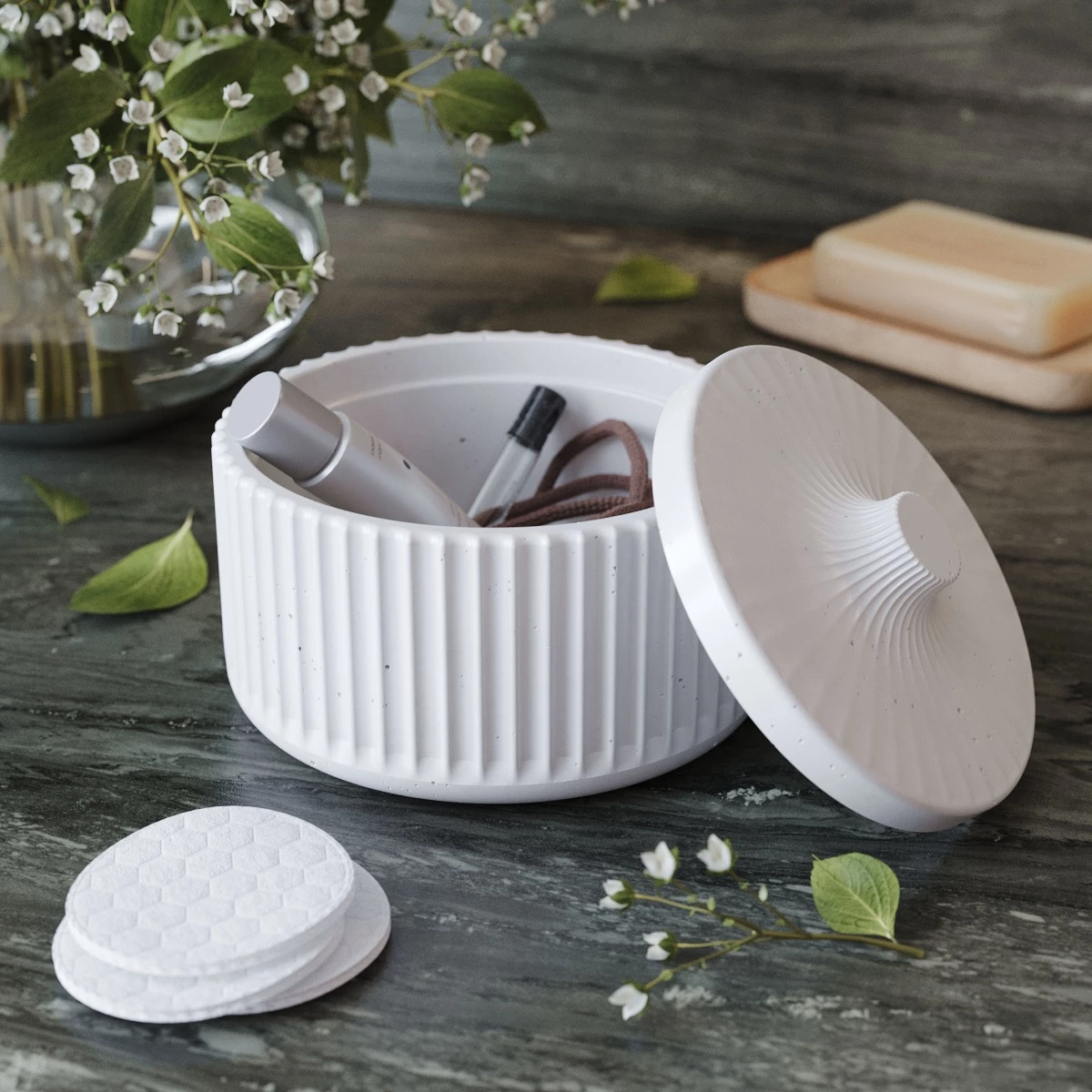 Chloe M - декоративная емкость с крышкой для хранения в ванной, изготовленная вручную из особо прочного бетона.