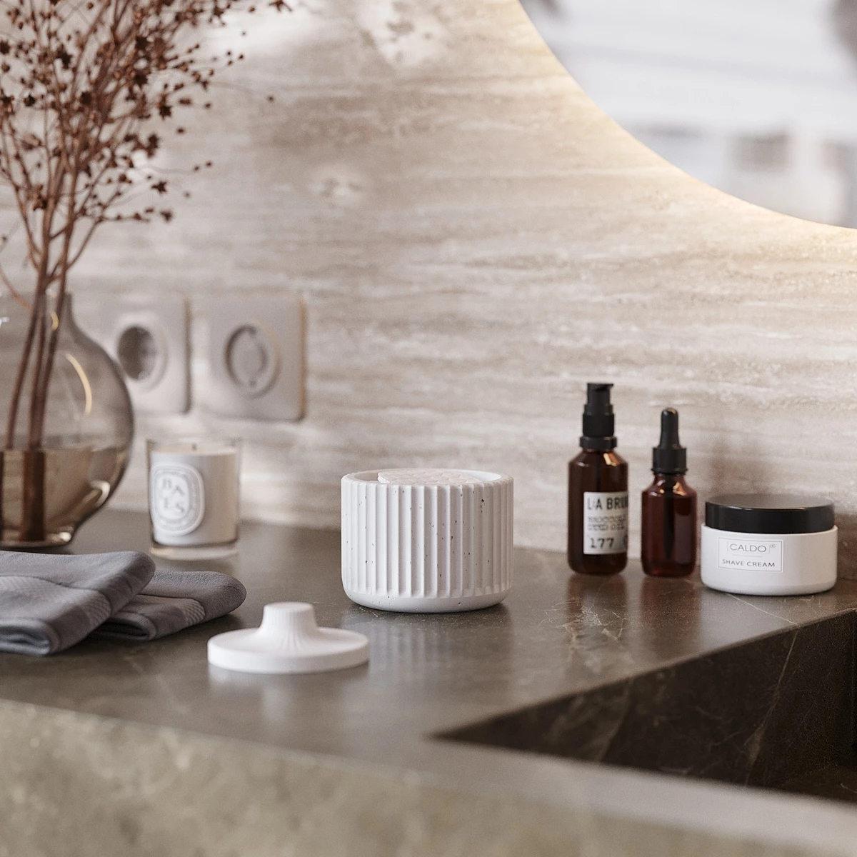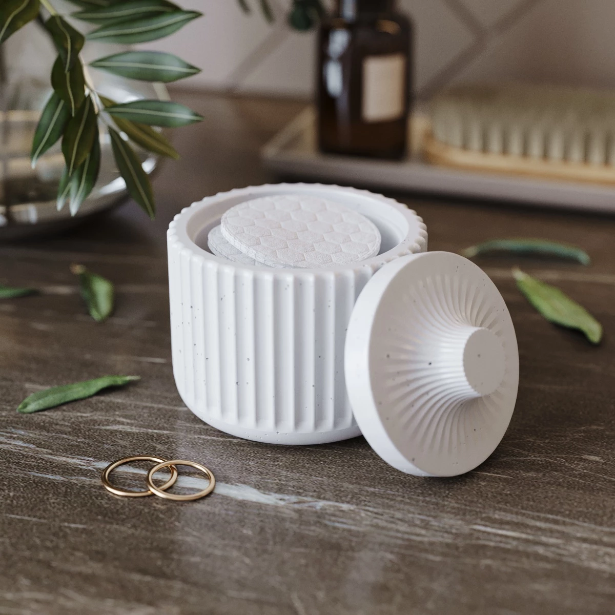 Декоративная подставка с крышкой Chloe XS для ватных дисков - это лаконичный и стильный интерьерный аксессуар, изготовленный вручную из архитектурного бетона.