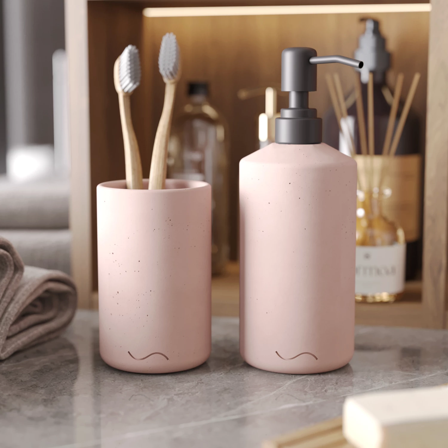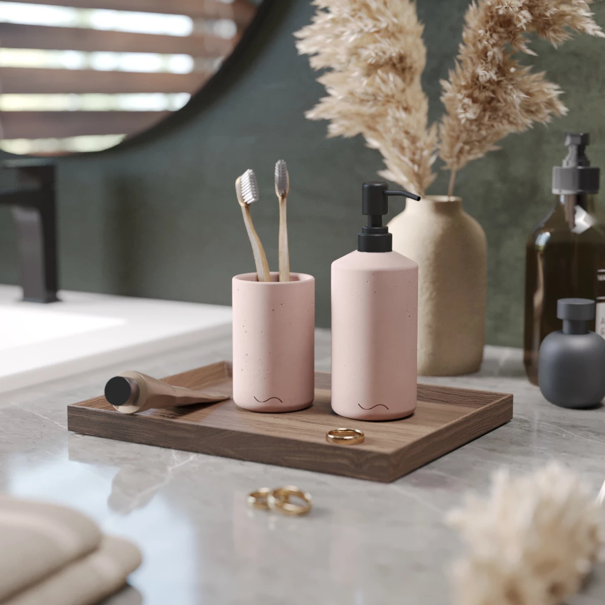 Набор для ванной комнаты отлично подойдет в качестве подарка. Благодаря своему минималистичному дизайну бетонные изделия идеально впишутся в любой интерьер, в частности в ванную в стиле сканди или джапанди.