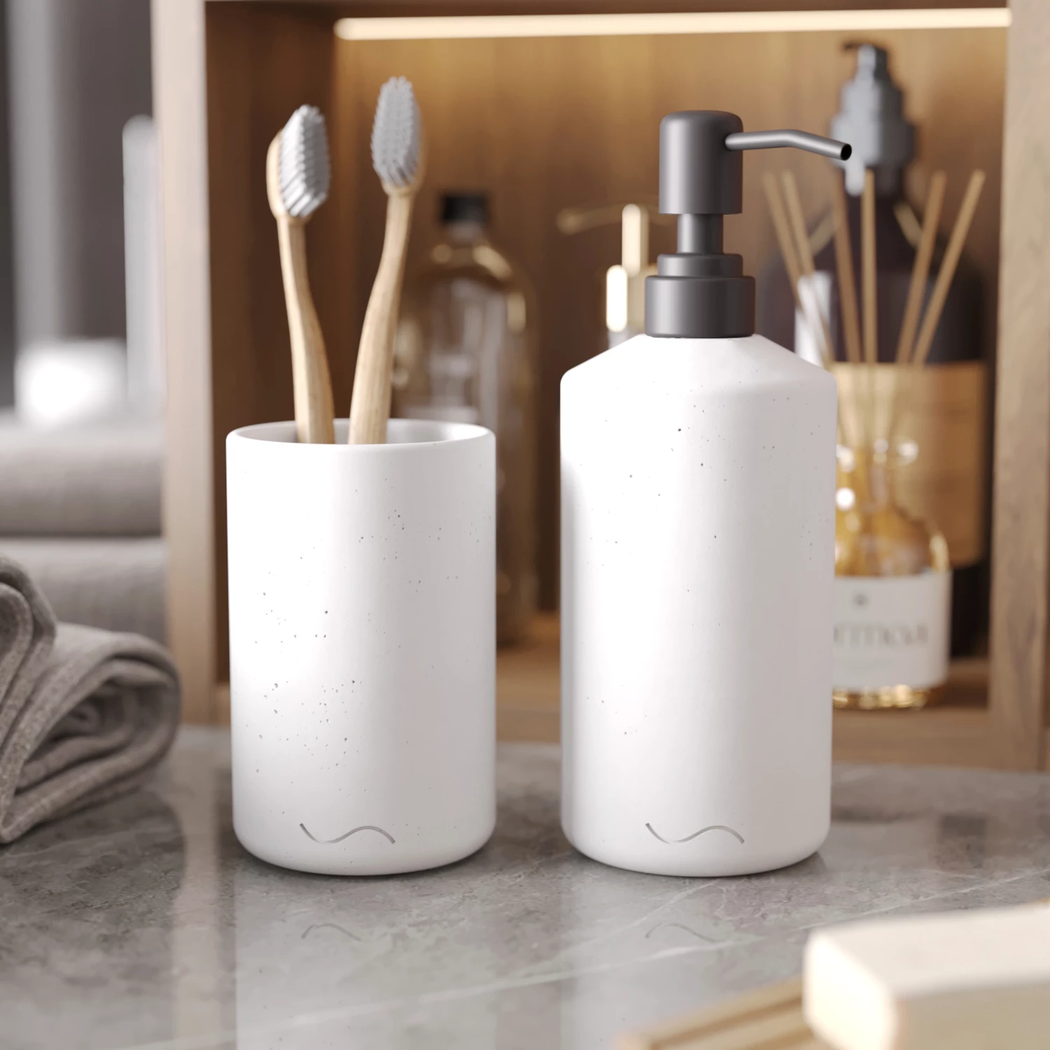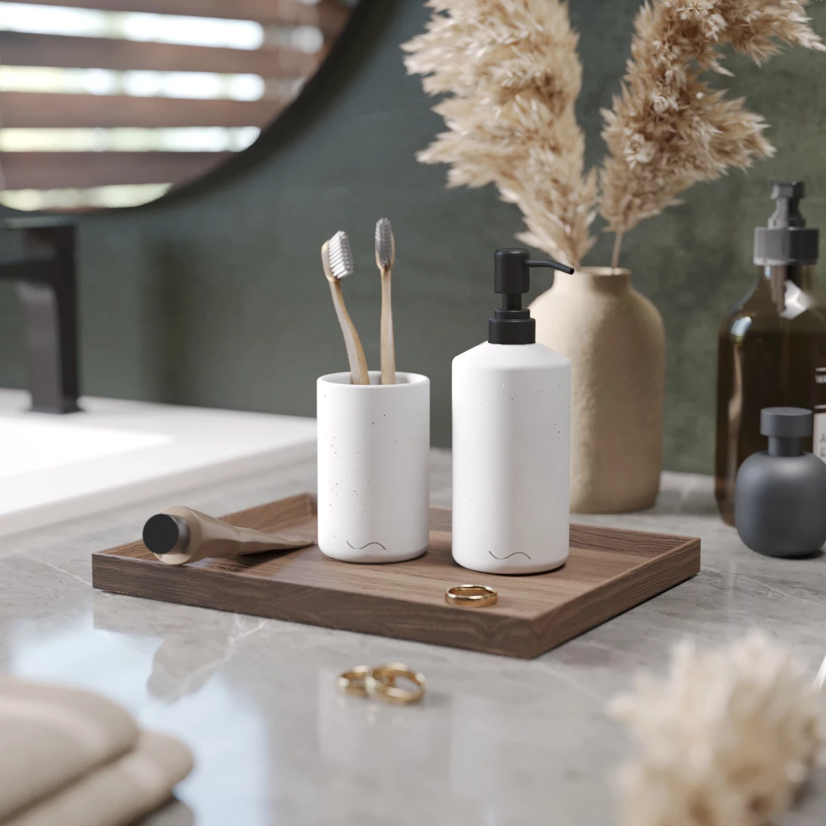 Набор для ванной комнаты отлично подойдет в качестве подарка. Благодаря своему минималистичному дизайну бетонные изделия идеально впишутся в любой интерьер, в частности в ванную в стиле сканди или джапанди.