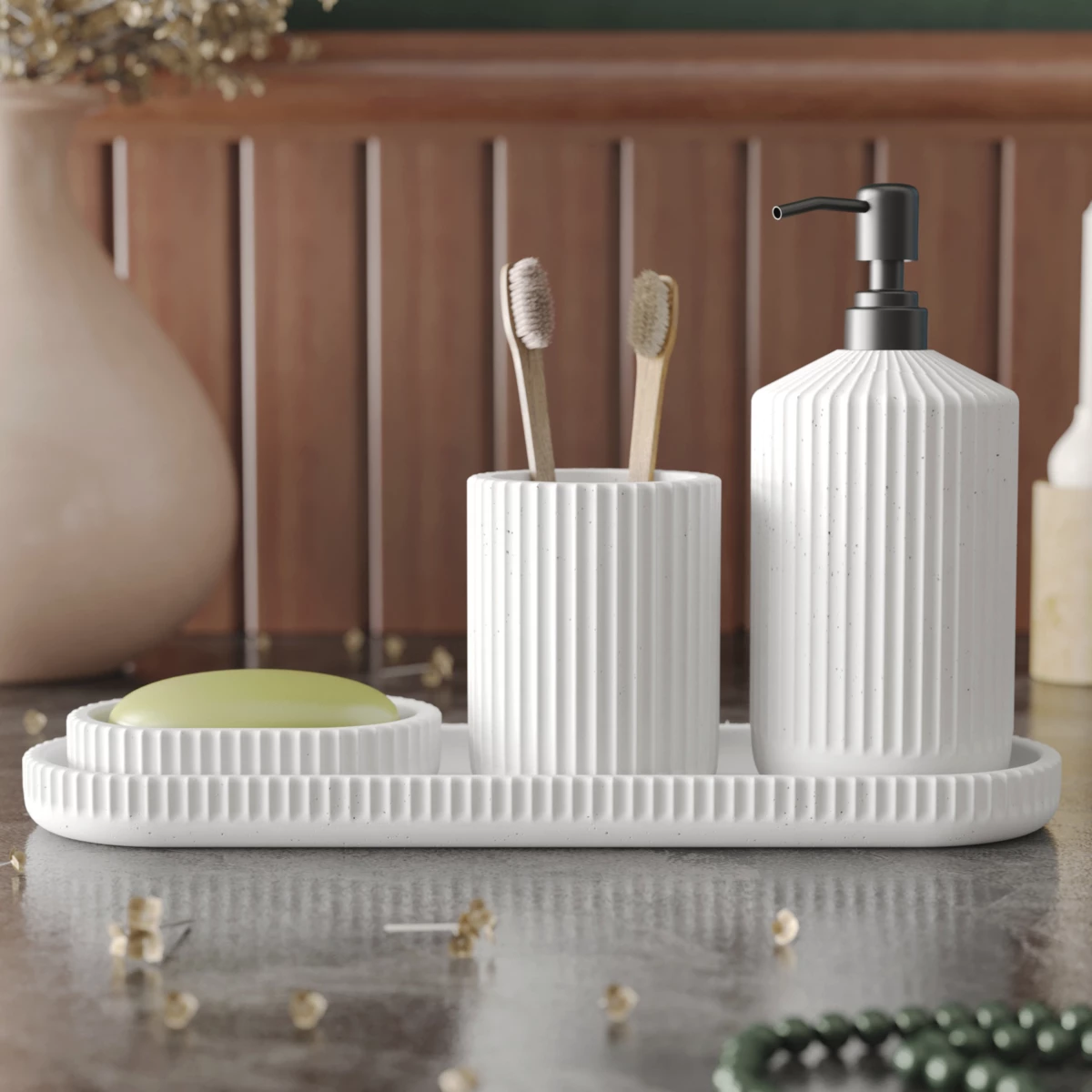 Набор Chloe №15 состоит из 4-х аксессуаров для ванной комнаты: подноса, дозатора для жидкого мыла, стакана для зубных щёток и пасты и мыльницы для кускового мыла.