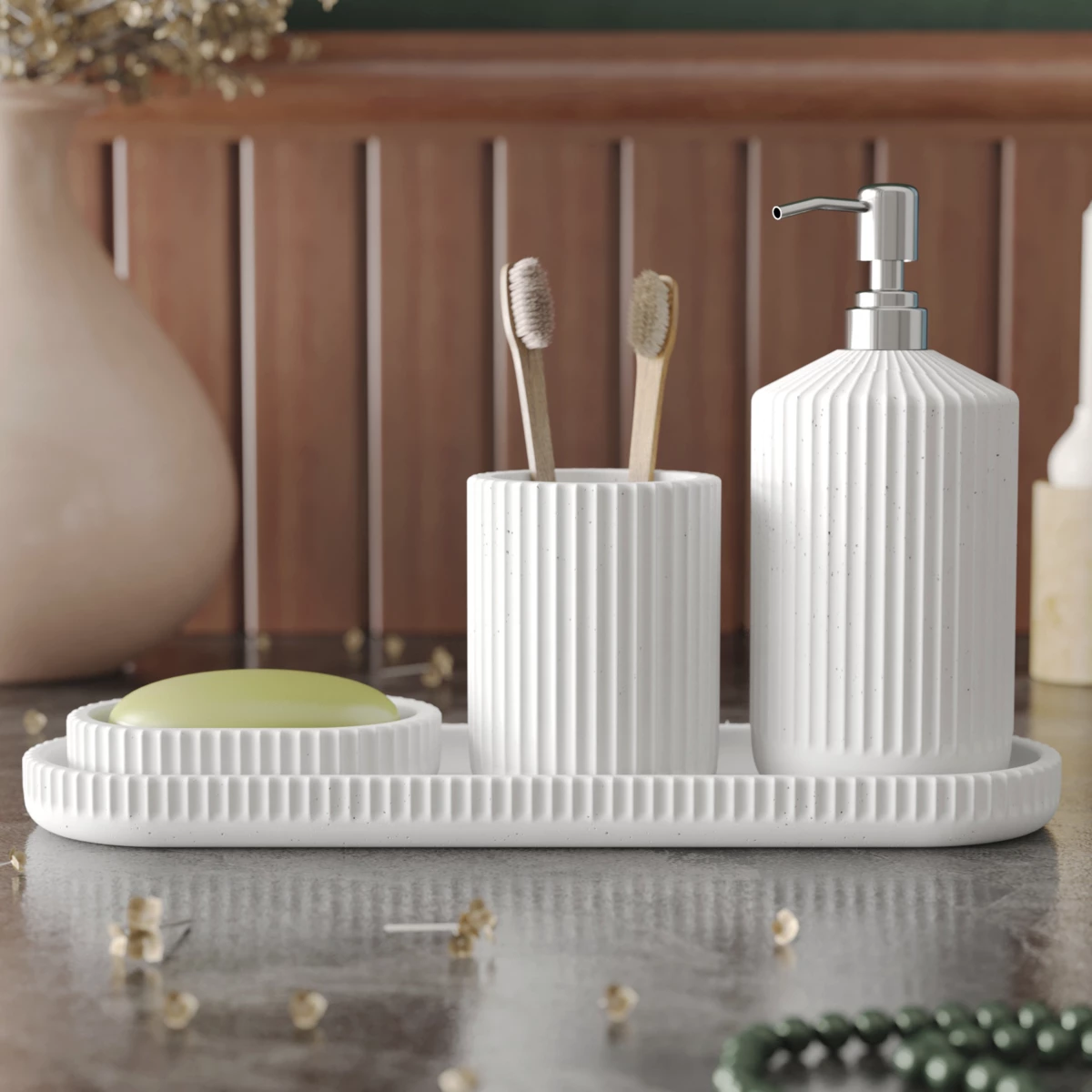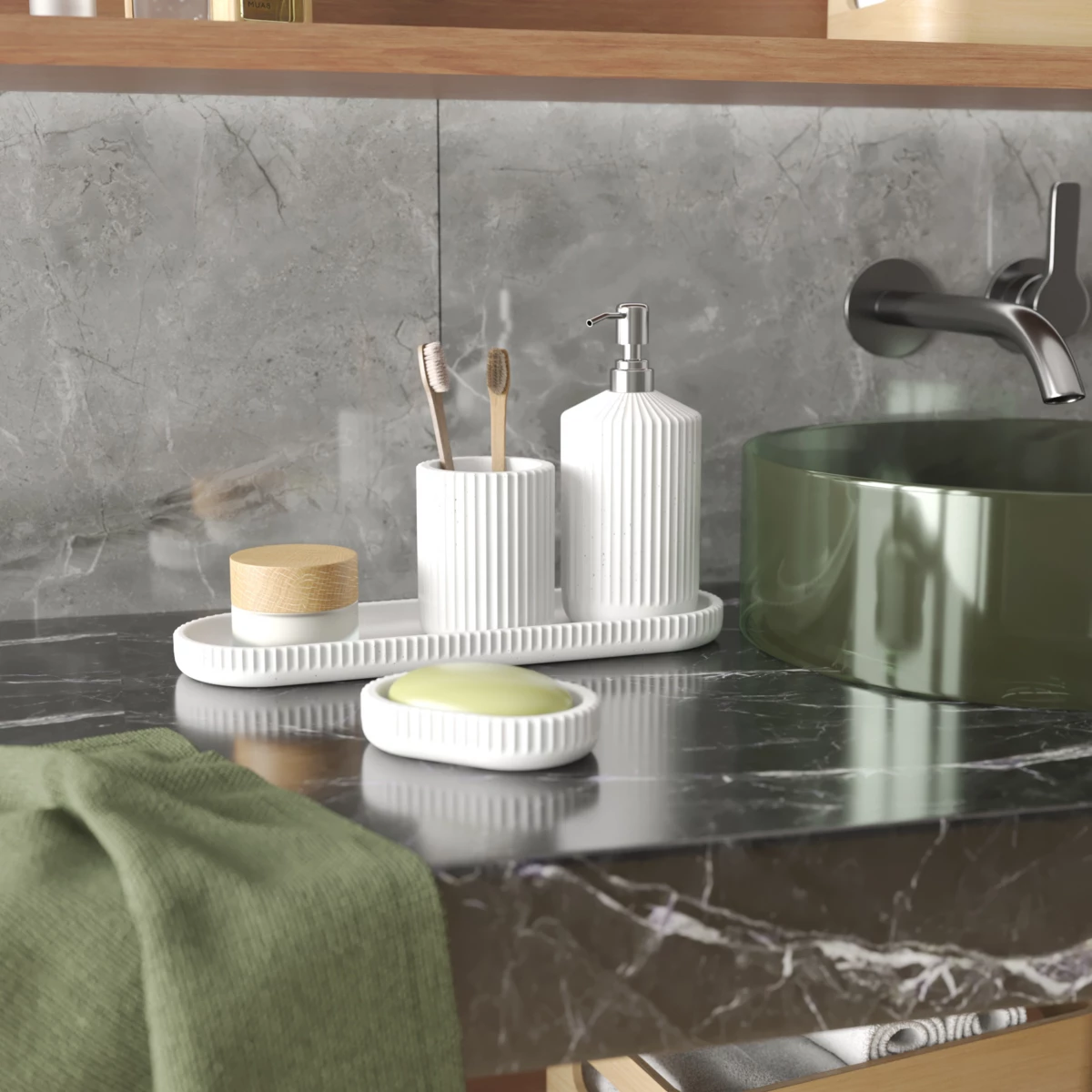 Набор Chloe №15 состоит из 4-х аксессуаров для ванной комнаты: подноса, дозатора для жидкого мыла, стакана для зубных щёток и пасты и мыльницы для кускового мыла.