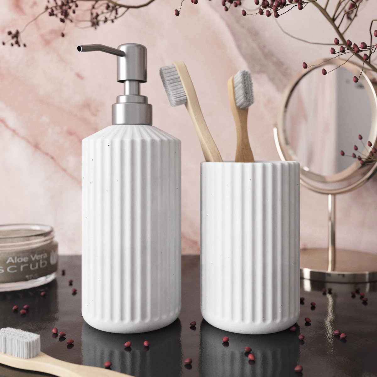 Набор для ванной комнаты отлично подойдет в качестве подарка. Благодаря своему минималистичному дизайну бетонные изделия идеально впишутся в любой интерьер, в частности в ванную в стиле сканди или джапанди.