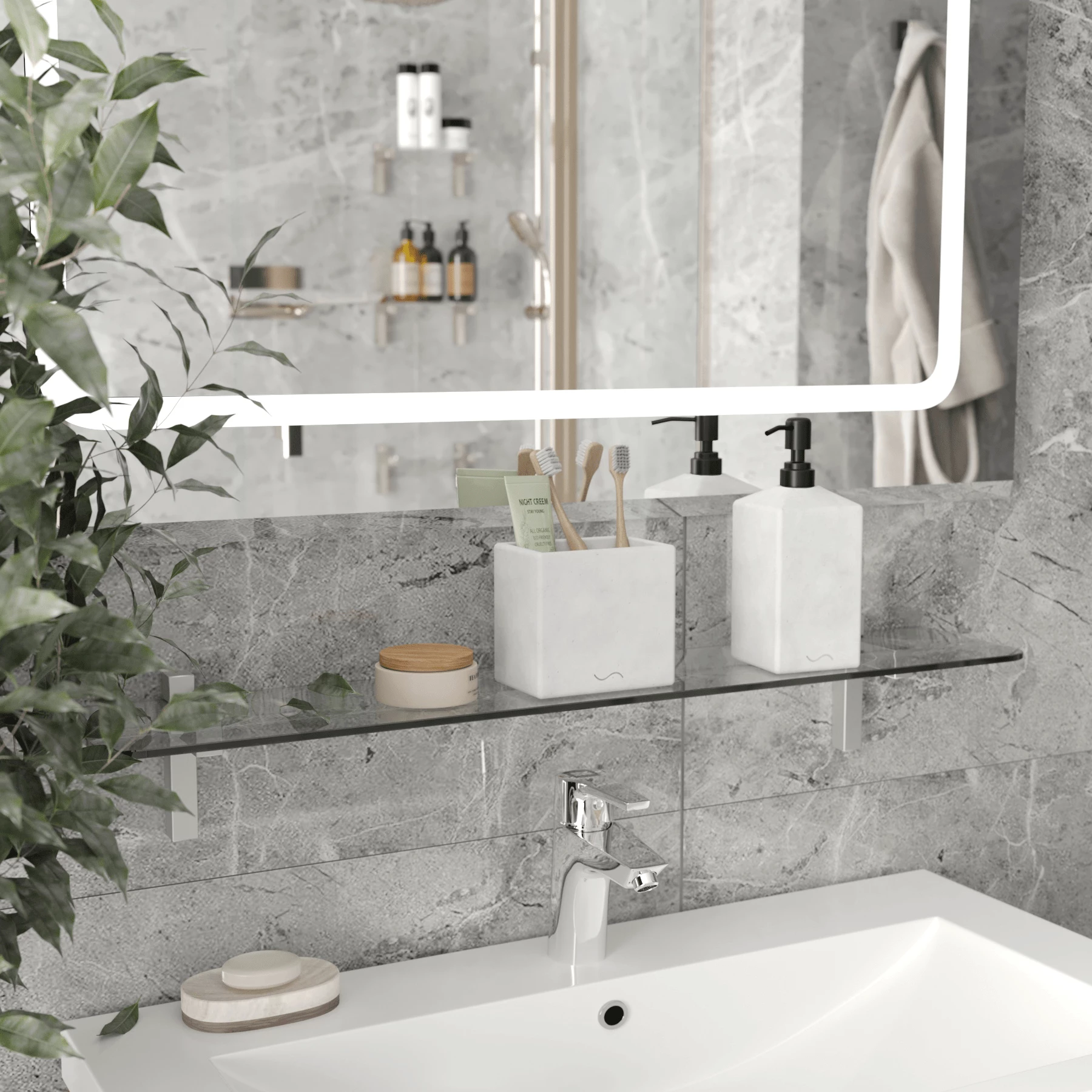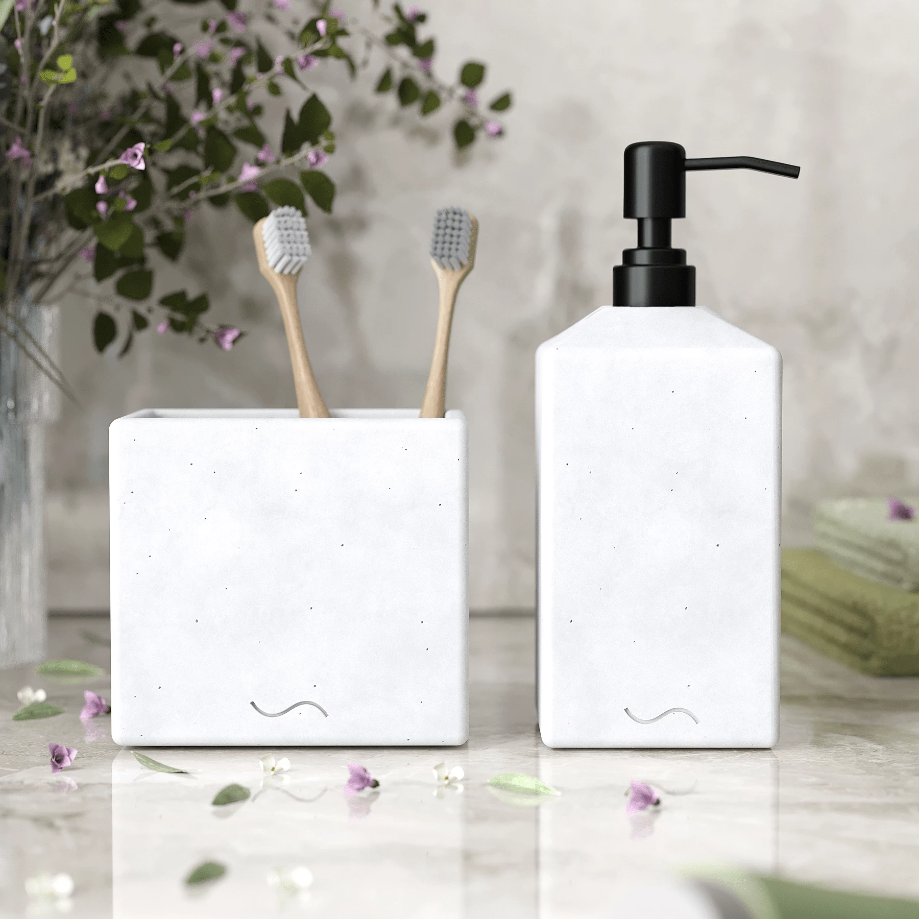 К каждому изделию в наборе прилагаются самоклеящиеся фетровые и силиконовые накладки. Набор для ванной комнаты отлично подойдет в качестве подарка. Лаконичный дизайн бетонных изделий позволяет им идеально вписаться в любой интерьер.