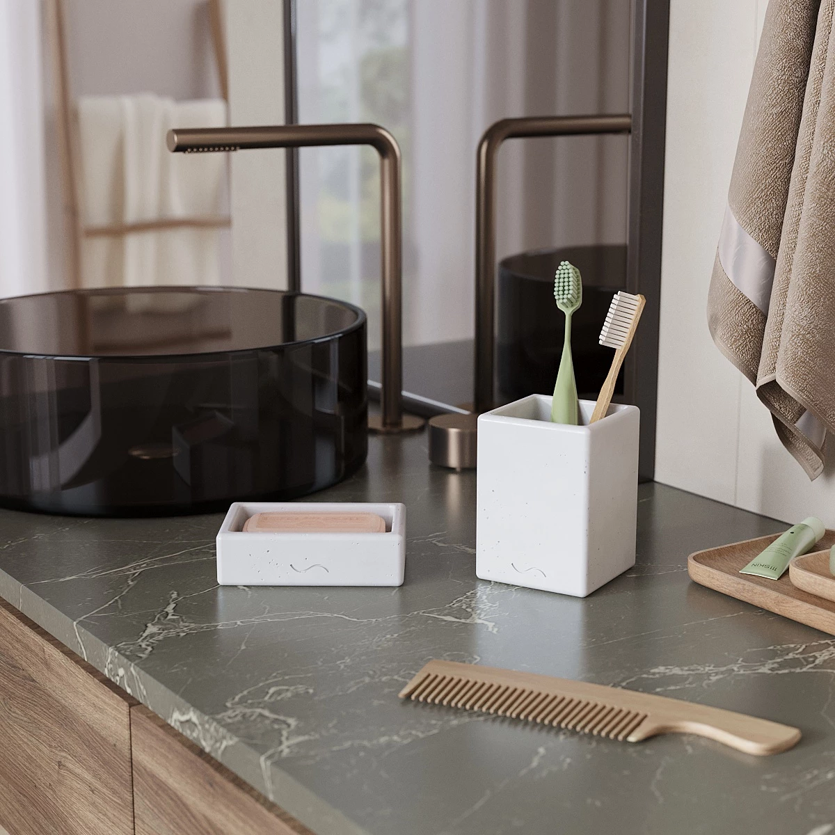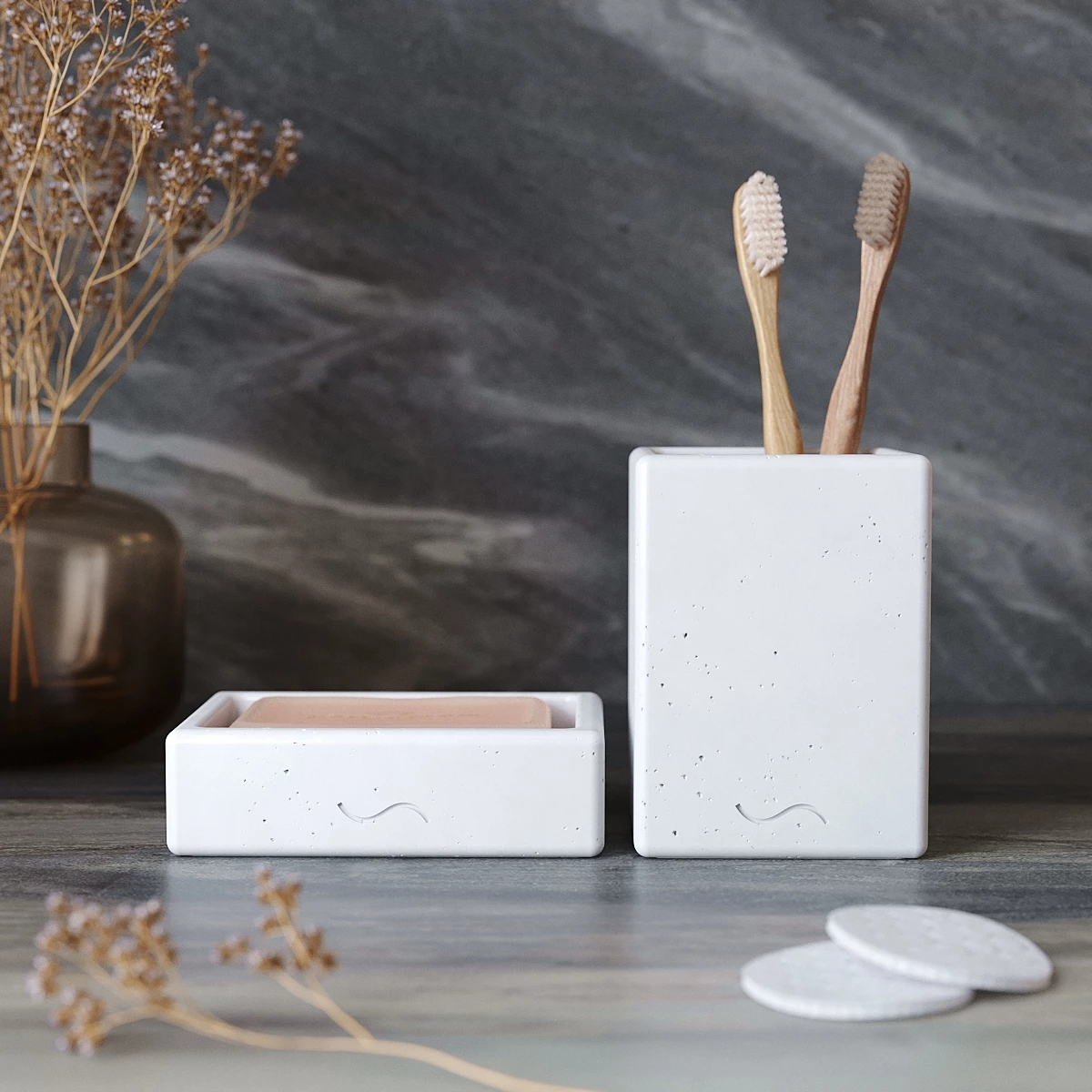 Лаконичный и стильный набор аксессуаров для ванной комнаты, изготовленный вручную из архитектурного бетона. Cтакан для зубных щеток и мыльница станут украшением вашей ванной и помогут организовать пространство.