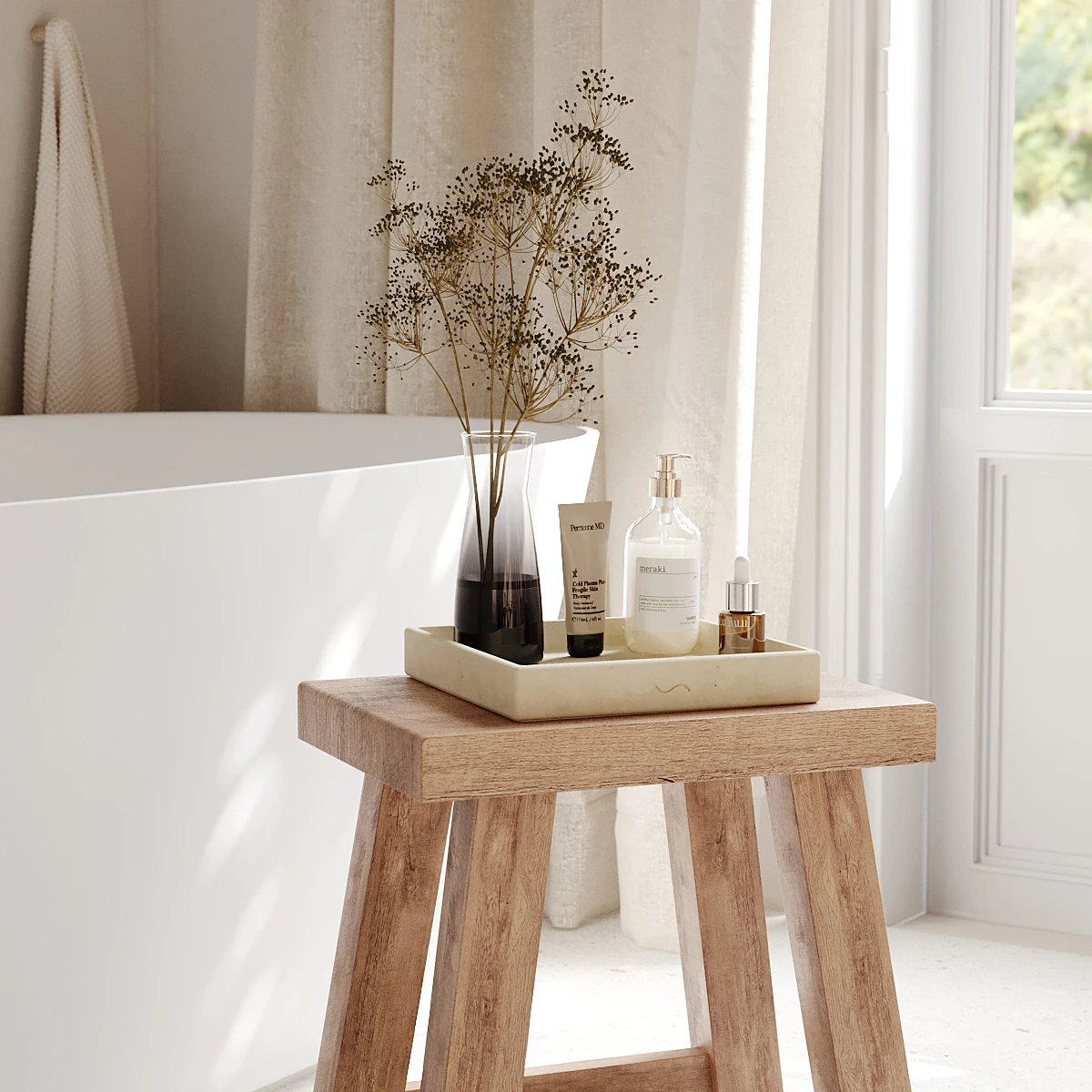 Emily L - универсальный интерьерный поднос для ванной, изготовленный вручную из особо прочного бетона. Изделие обработано специальным лаком (глянцевым или матовым), защищающим поверхность от воды и грязи.
