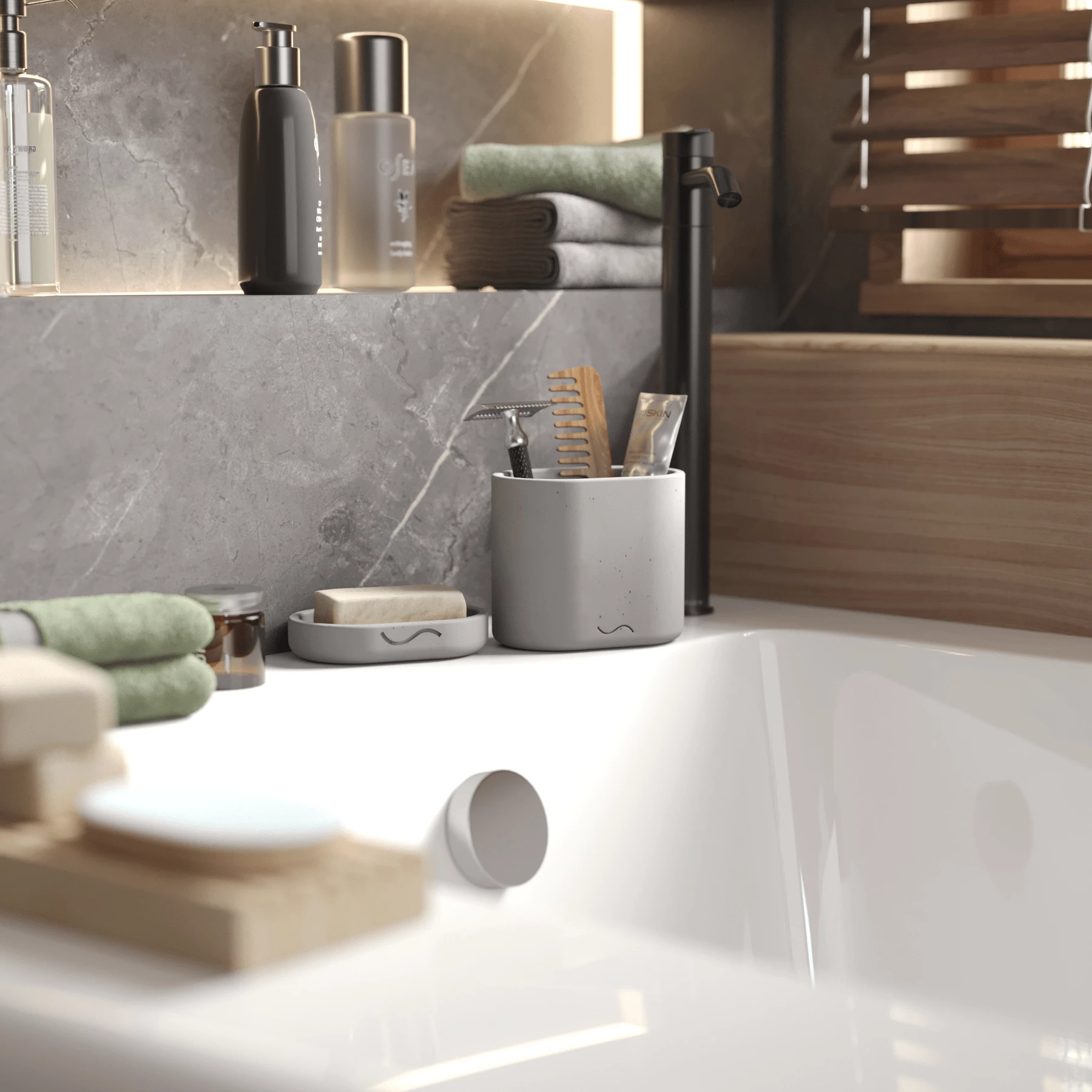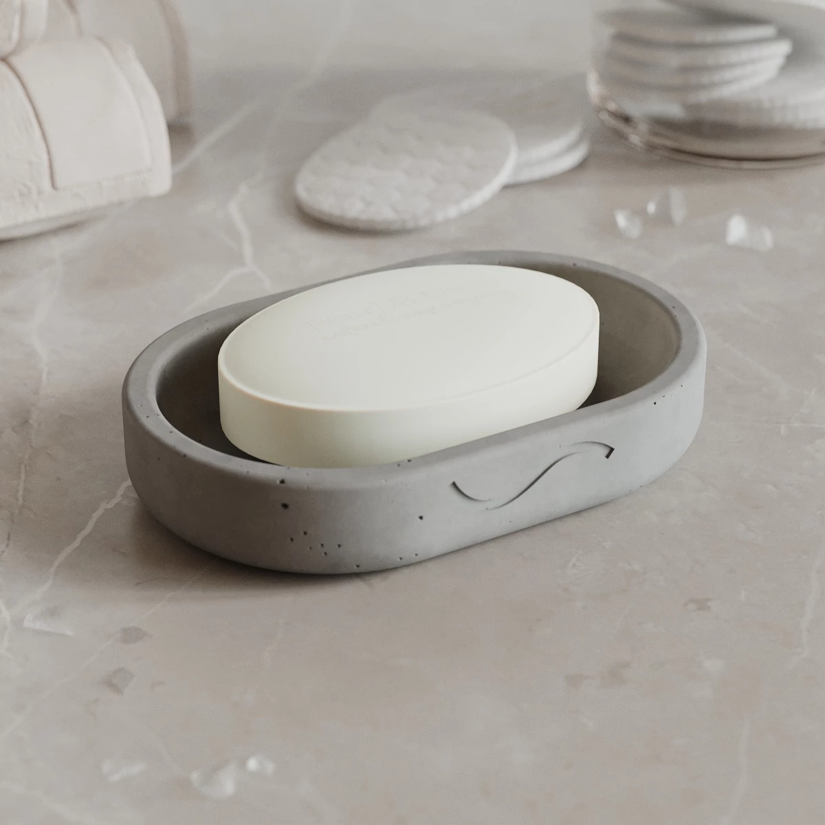 К каждому изделию в наборе прилагаются самоклеящиеся фетровые и силиконовые накладки. Набор для ванной комнаты отлично подойдет в качестве подарка. Лаконичный дизайн бетонных изделий позволяет им идеально вписаться в любой интерьер.