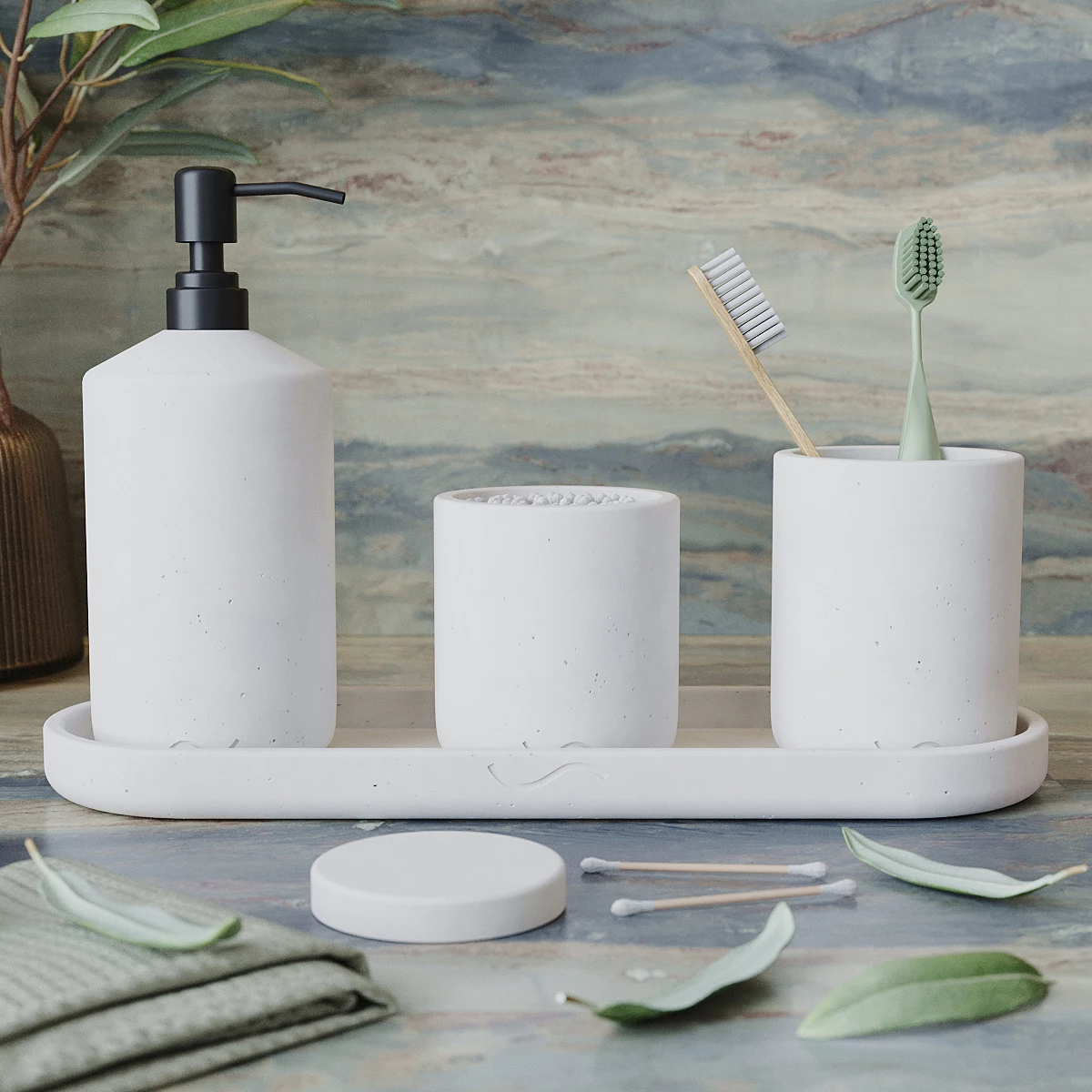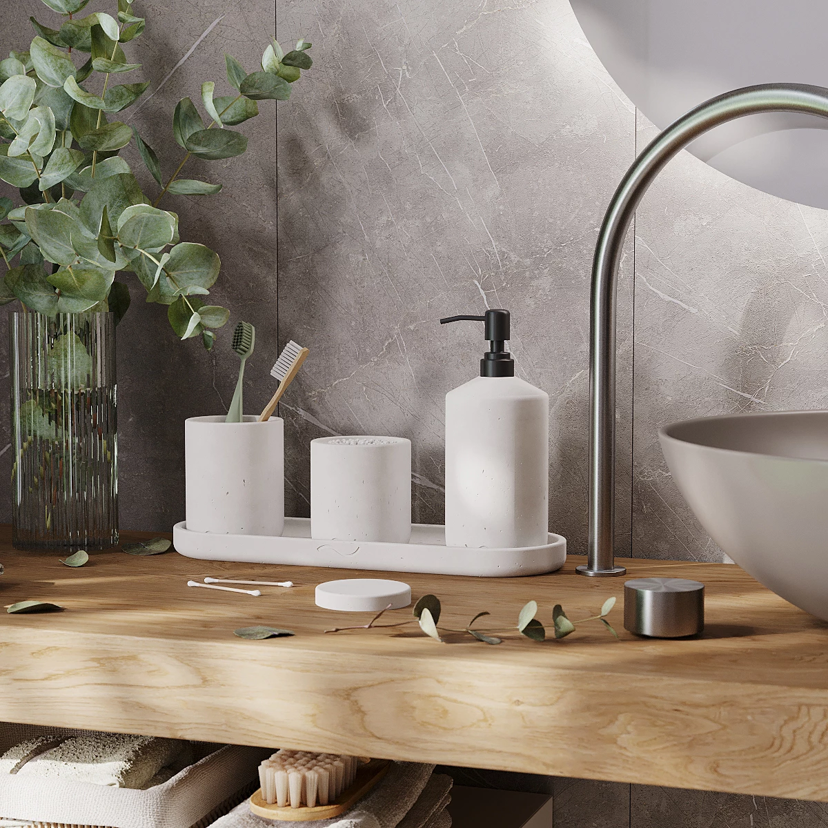 Лаконичный и стильный набор аксессуаров для ванной комнаты, изготовленный вручную из архитектурного бетона. Поднос, стакан для зубных щеток и банка с крышкой для ватных дисков и палочек и дозатор для мыла станут украшением вашей ванной и помогут организовать пространство.