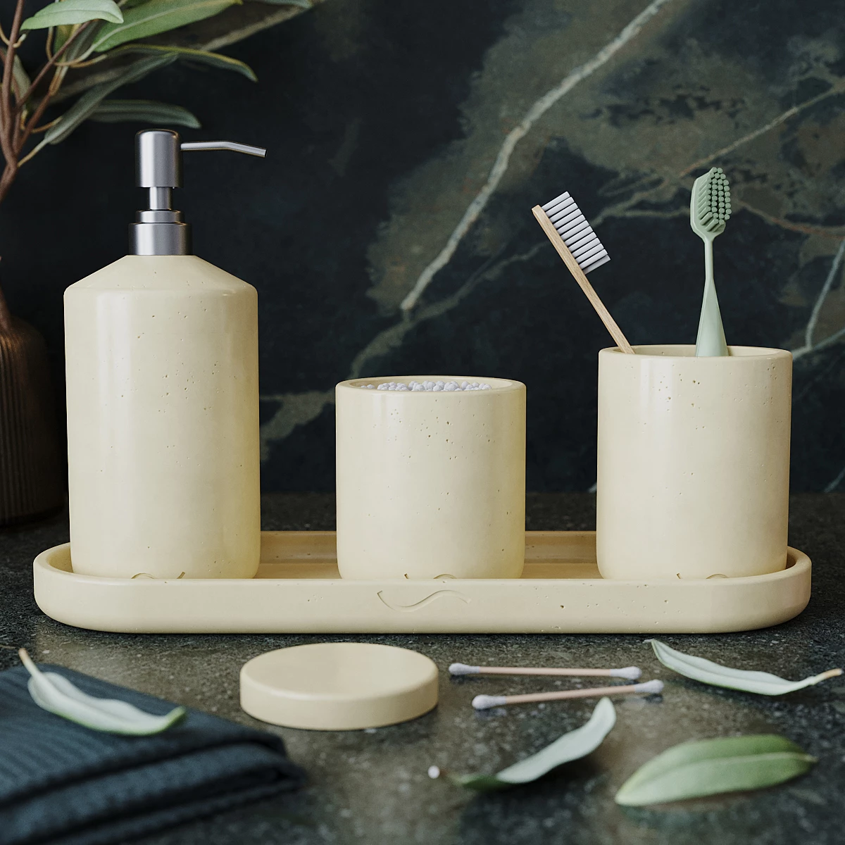 Лаконичный и стильный набор аксессуаров для ванной комнаты, изготовленный вручную из архитектурного бетона. Поднос, стакан для зубных щеток и банка с крышкой для ватных дисков и палочек и дозатор для мыла станут украшением вашей ванной и помогут организовать пространство.