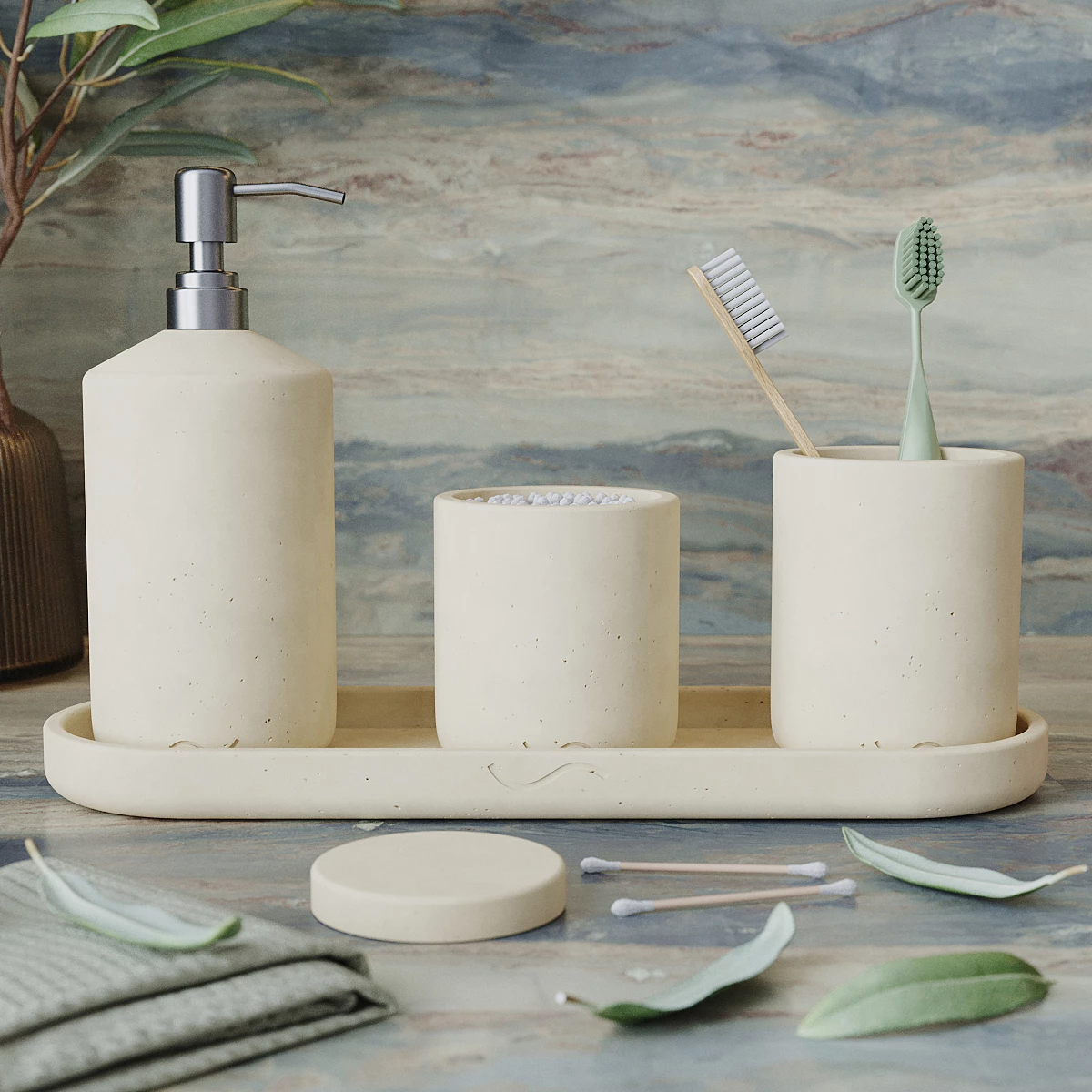 Лаконичный и стильный набор аксессуаров для ванной комнаты, изготовленный вручную из архитектурного бетона. Поднос, стакан для зубных щеток и банка с крышкой для ватных дисков и палочек и дозатор для мыла станут украшением вашей ванной и помогут организовать пространство.