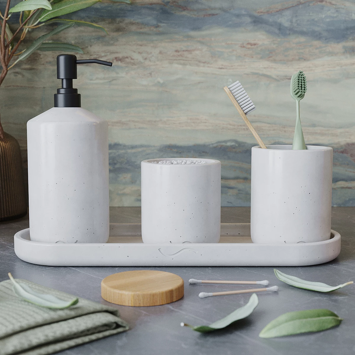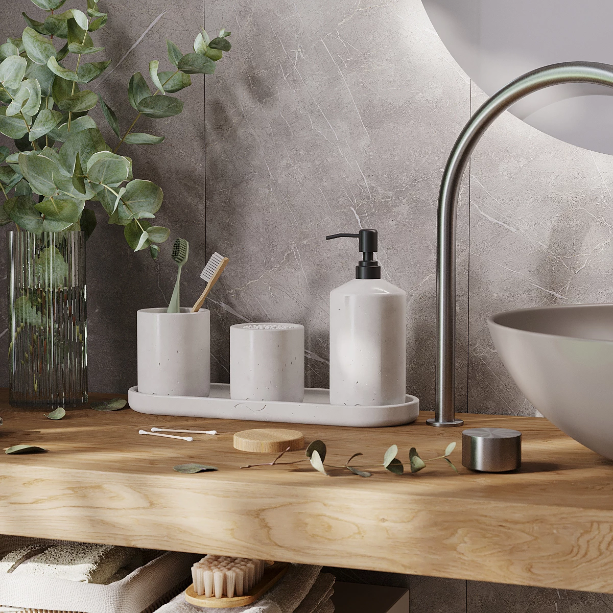 Лаконичный и стильный набор аксессуаров для ванной комнаты, изготовленный вручную из архитектурного бетона. Поднос, стакан для зубных щеток и банка с крышкой для ватных дисков и палочек и дозатор для мыла станут украшением вашей ванной и помогут организовать пространство.