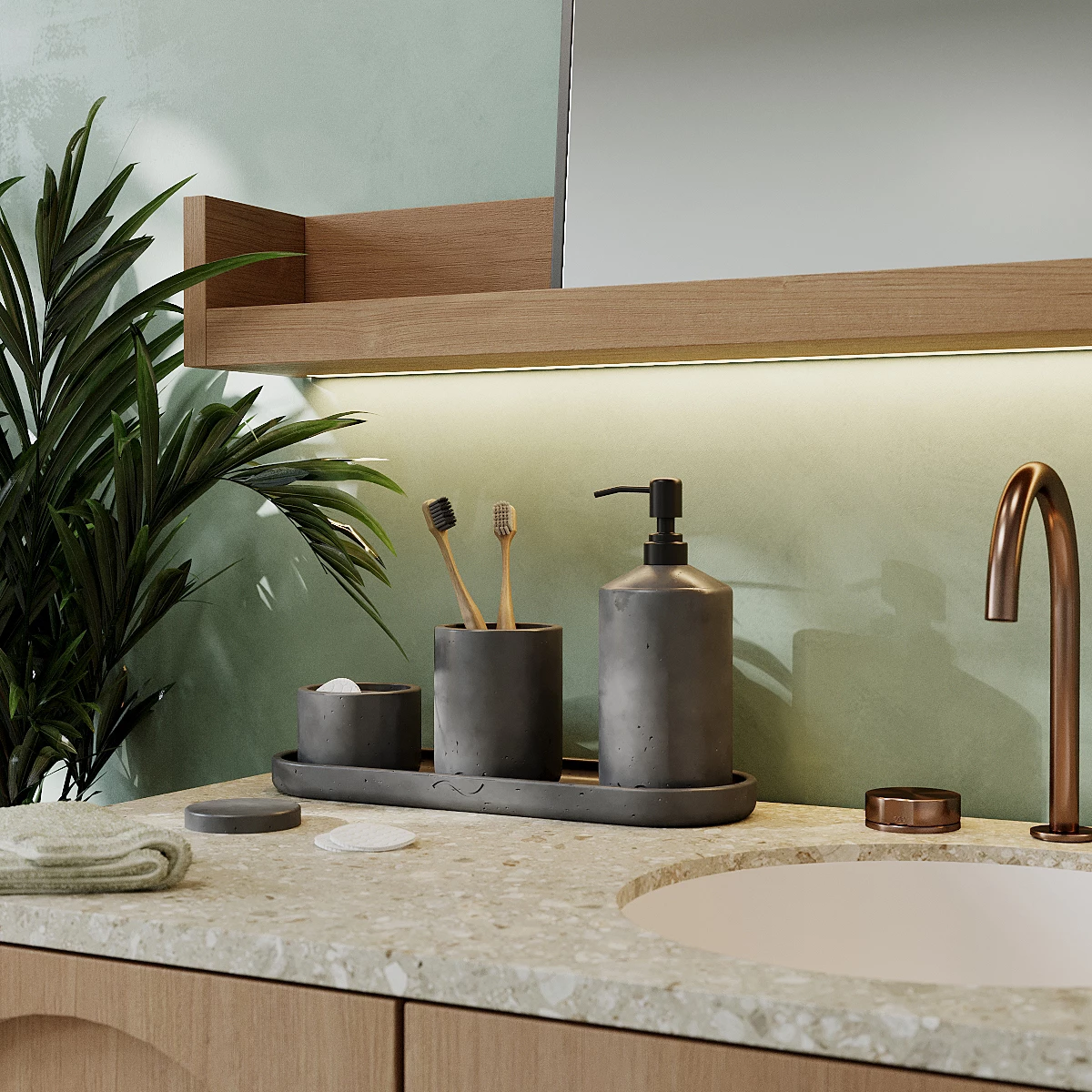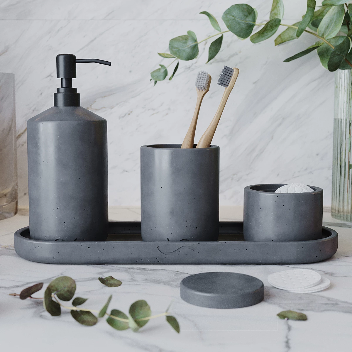 Лаконичный и стильный набор аксессуаров для ванной комнаты, изготовленный вручную из архитектурного бетона. Поднос, стакан для зубных щеток и банка с крышкой для ватных дисков и палочек станут украшением вашей ванной и помогут организовать пространство.
