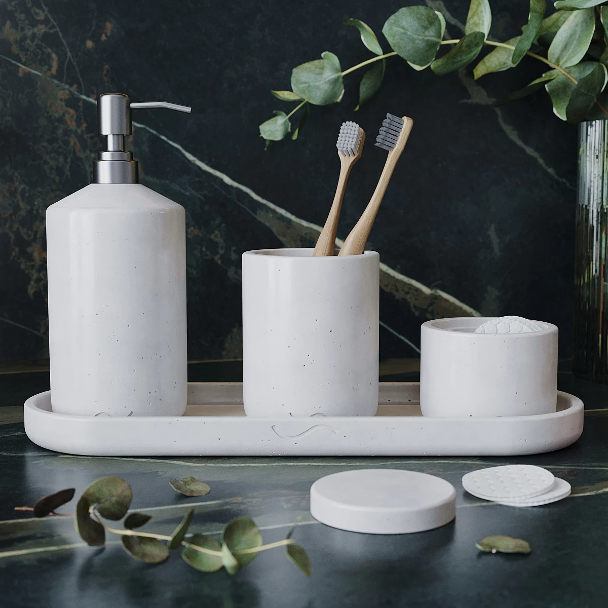 Лаконичный и стильный набор аксессуаров для ванной комнаты, изготовленный вручную из архитектурного бетона. Поднос, стакан для зубных щеток и банка с крышкой для ватных дисков и палочек станут украшением вашей ванной и помогут организовать пространство.