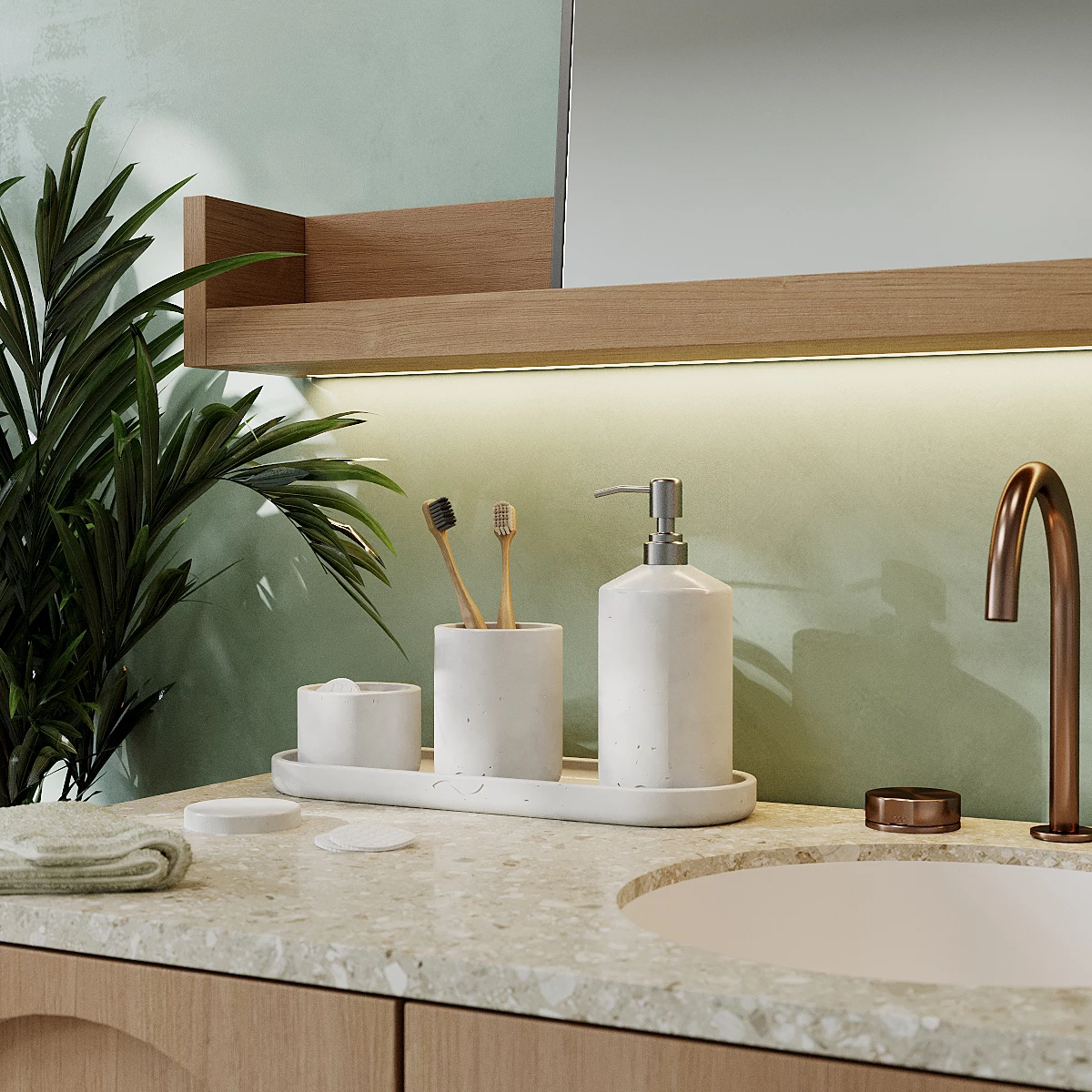 Минималистичный дизайн декоративного набора для ванной позволяет ему идеально вписаться в любой интерьер, привнося в него частичку скандинавской эстетики.