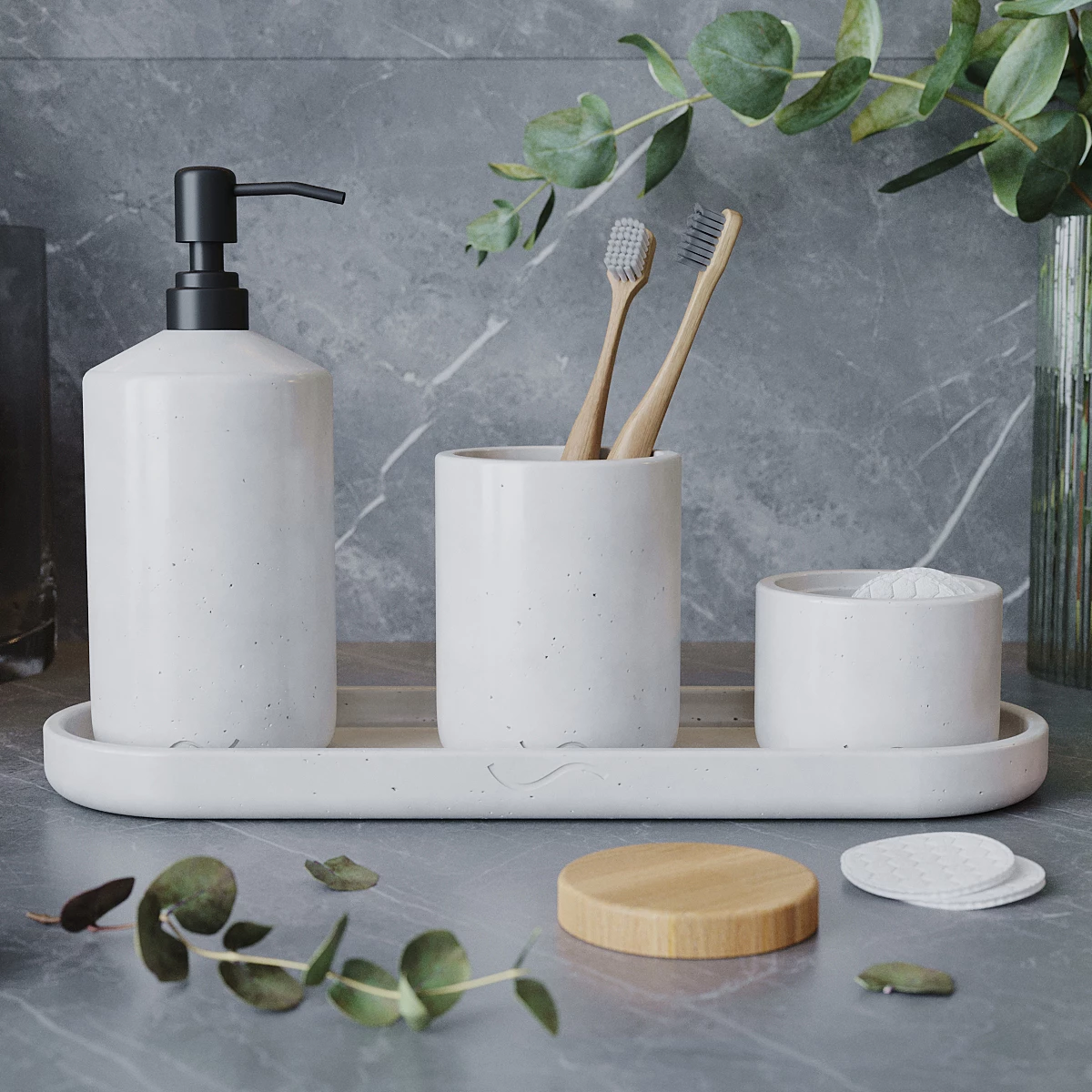 Лаконичный и стильный набор аксессуаров для ванной комнаты, изготовленный вручную из архитектурного бетона. Поднос, стакан для зубных щеток и банка с крышкой для ватных дисков и палочек станут украшением вашей ванной и помогут организовать пространство.
