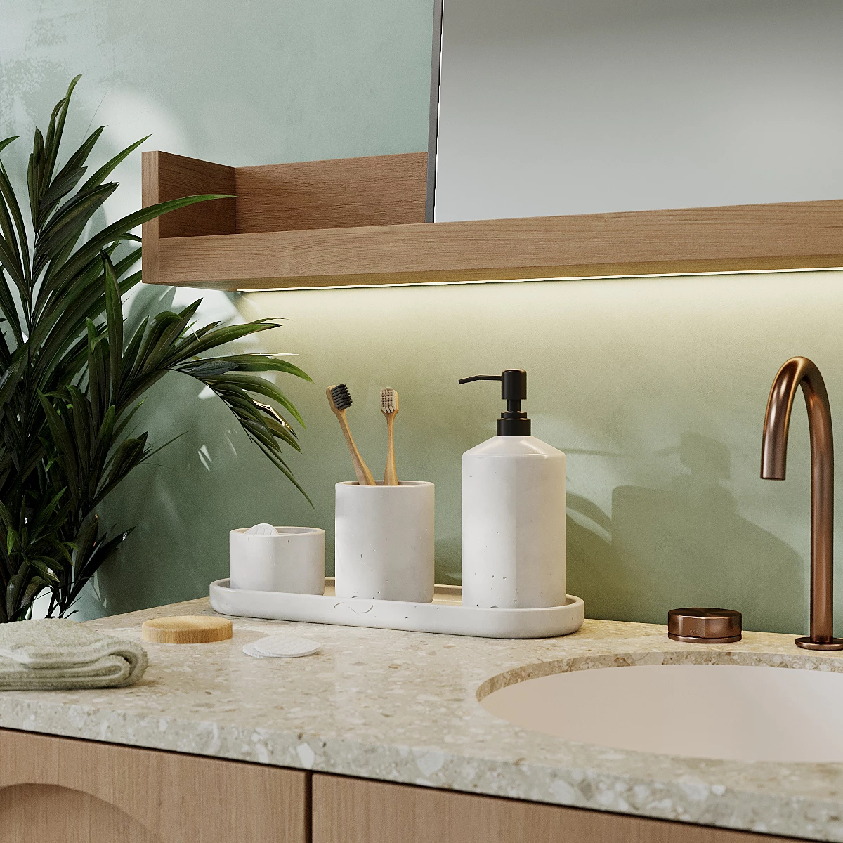 Минималистичный дизайн декоративного набора для ванной позволяет ему идеально вписаться в любой интерьер, привнося в него частичку скандинавской эстетики.