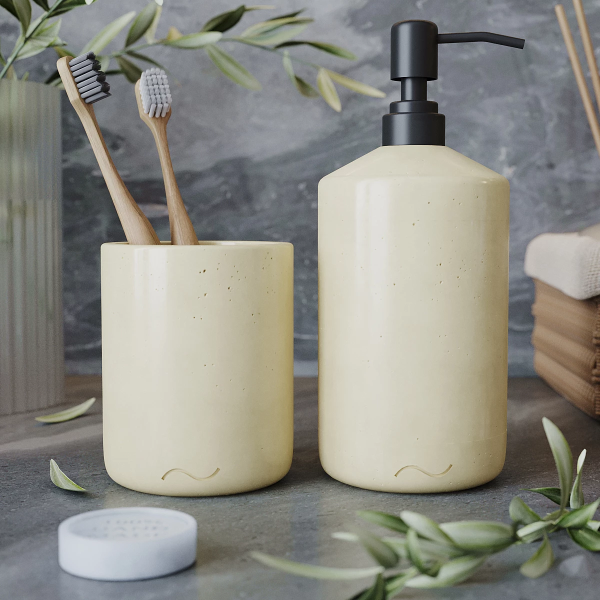 Лаконичный и стильный набор аксессуаров для ванной комнаты, изготовленный вручную из архитектурного бетона. Стакан для зубных щеток и дозатор для мыла станут украшением вашей ванной и помогут организовать пространство.