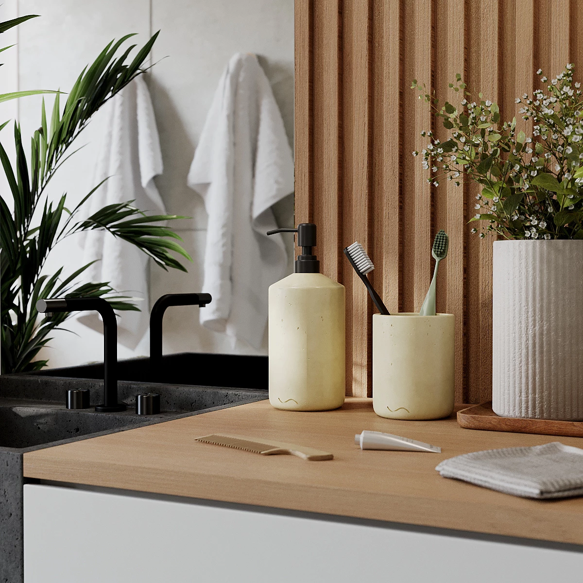 Минималистичный дизайн декоративного набора для ванной позволяет ему идеально вписаться в любой интерьер, привнося в него частичку скандинавской эстетики.