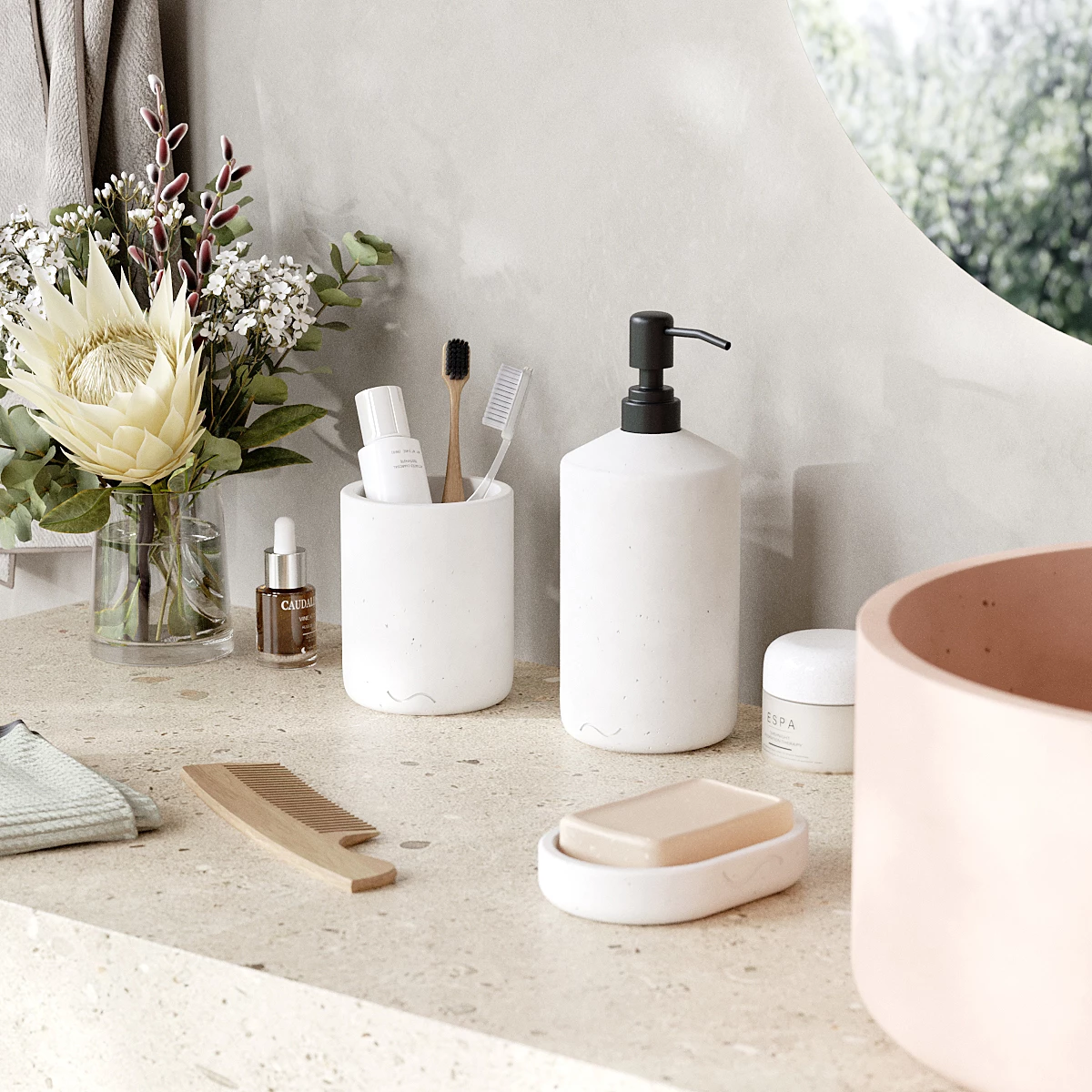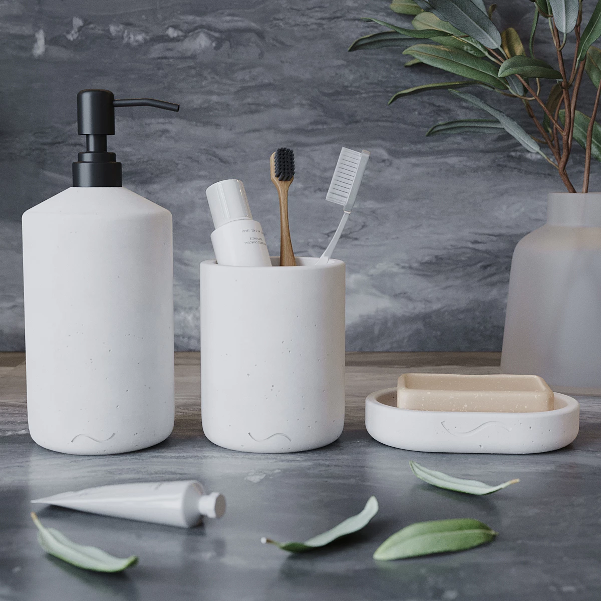 Набор для ванной комнаты отлично подойдет в качестве подарка. Минималистичный дизайн бетонных изделий позволяет им идеально вписаться в любой интерьер.