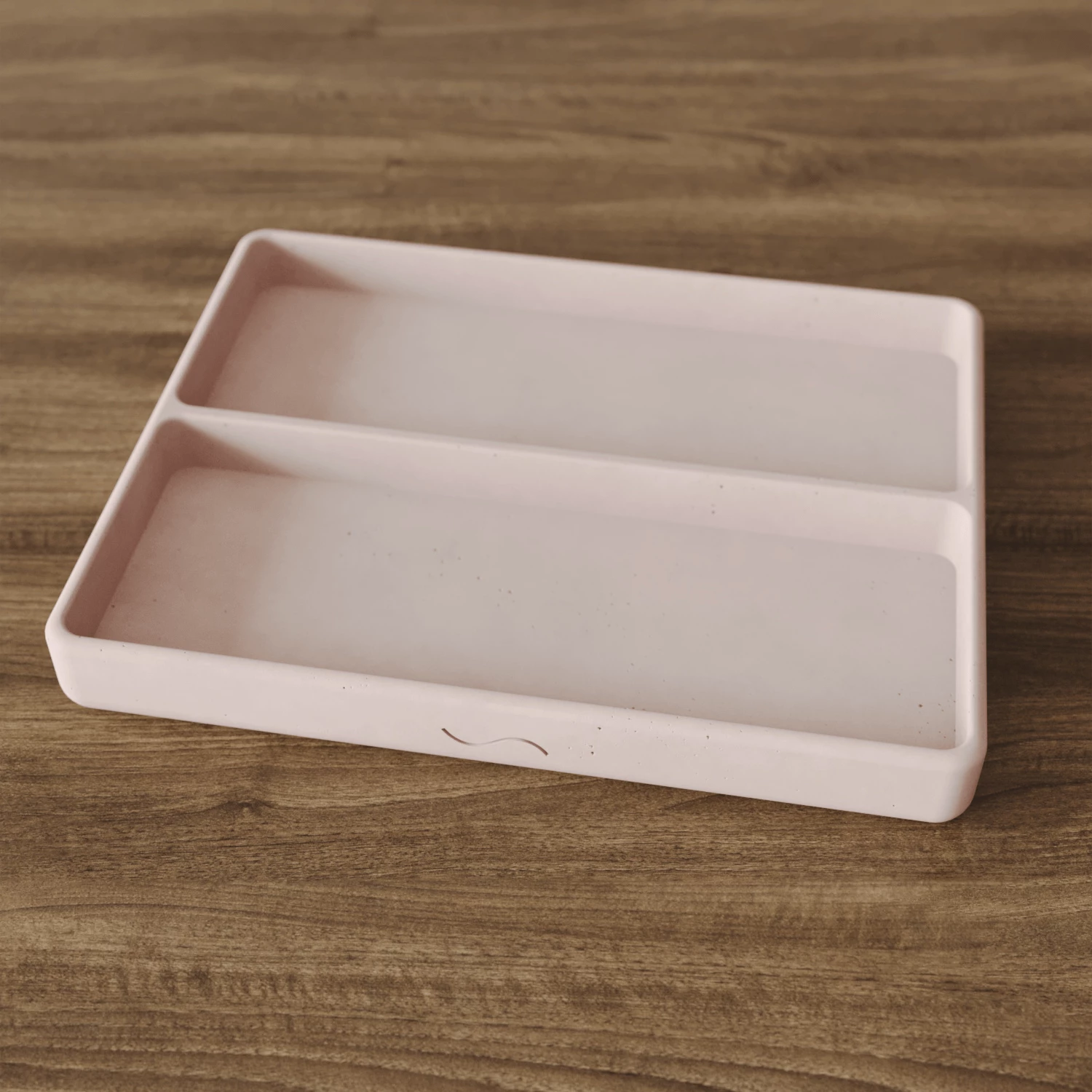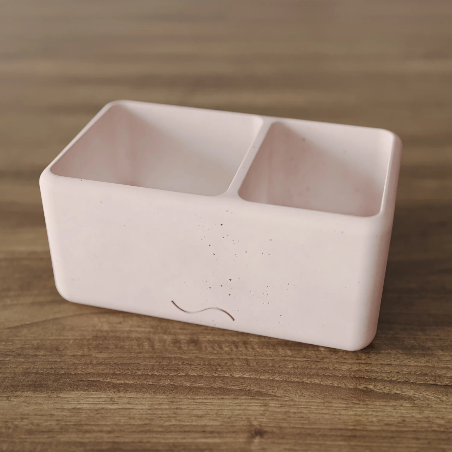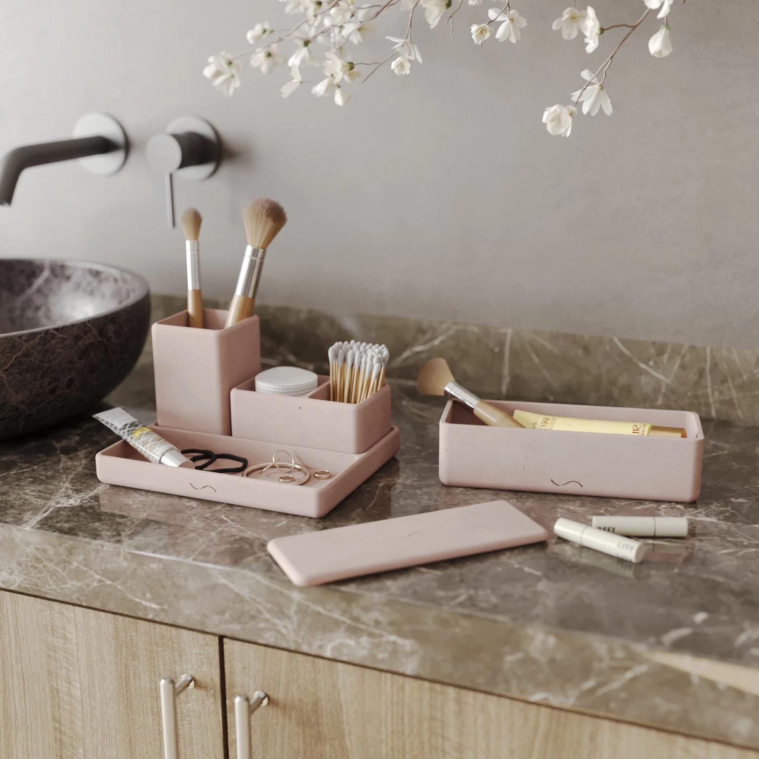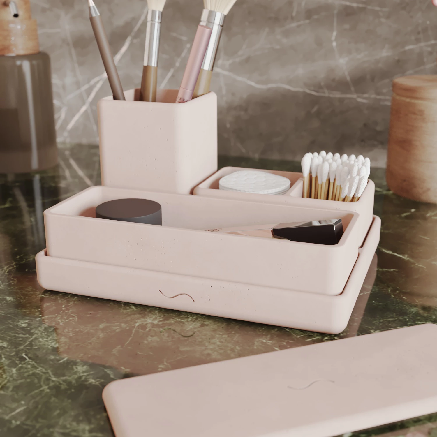 Стакан подойдёт для удобного хранения зубных щёток и пасты. Двойной контейнер можно использовать для ватных палочек и дисков, а контейнер с крышкой - для украшений, аксессуаров или других мелочей. Все изделия прекрасно размещаются на функциональном и эстетичном подносе.