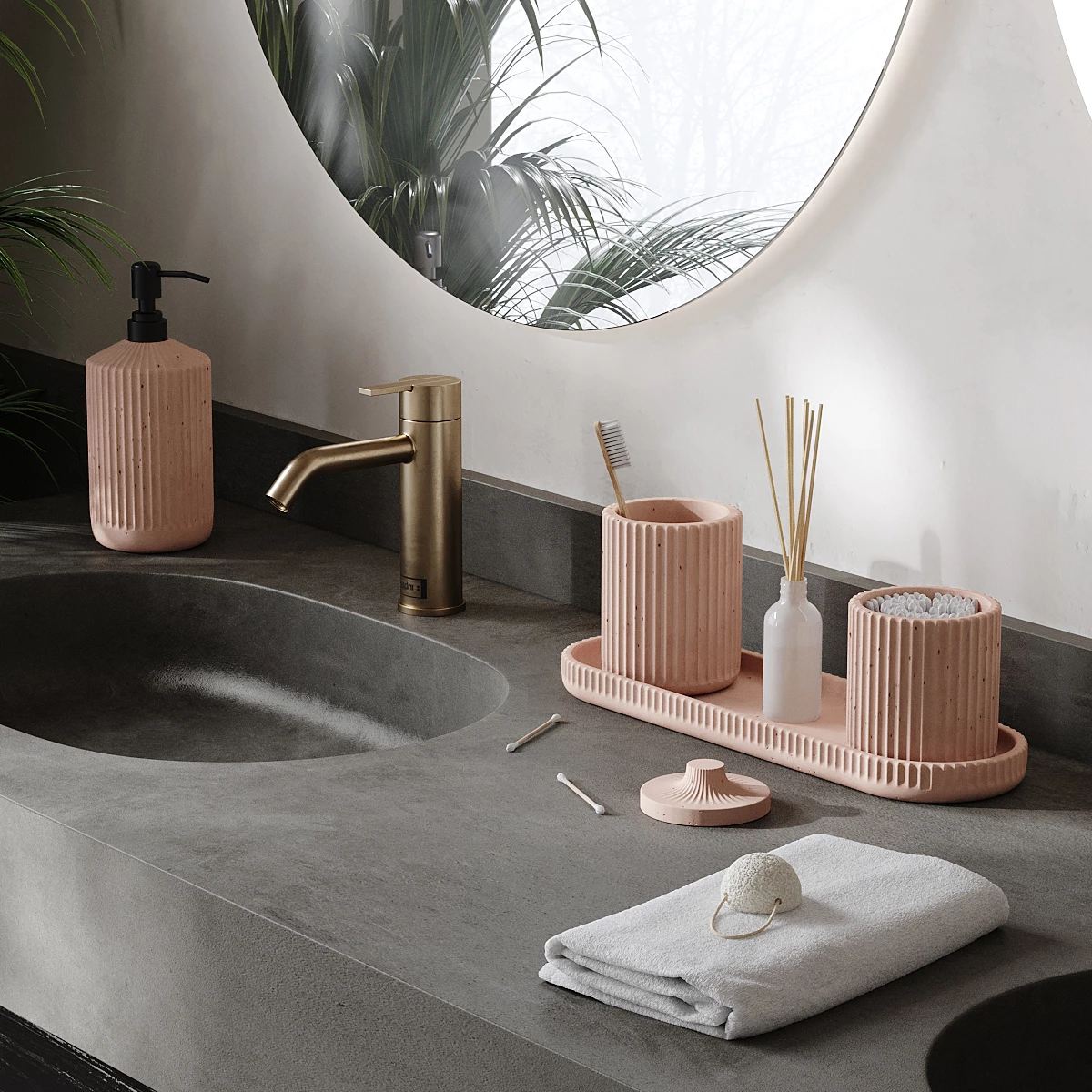 Набор для ванной комнаты отлично подойдет в качестве подарка. Лаконичный дизайн бетонных изделий позволяет им идеально вписаться в любой интерьер.