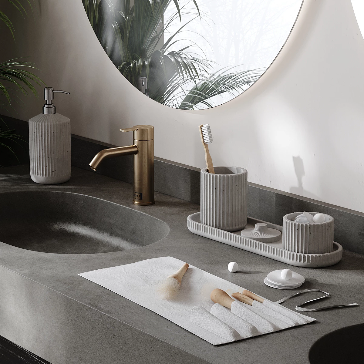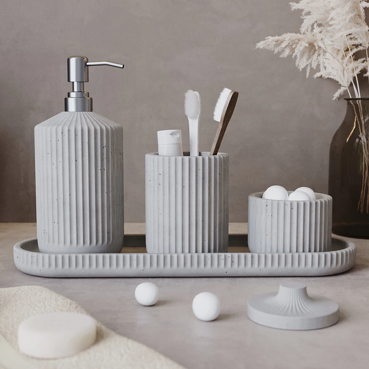 Набор для ванной комнаты отлично подойдет в качестве подарка. Лаконичный дизайн бетонных изделий позволяет им идеально вписаться в любой интерьер.