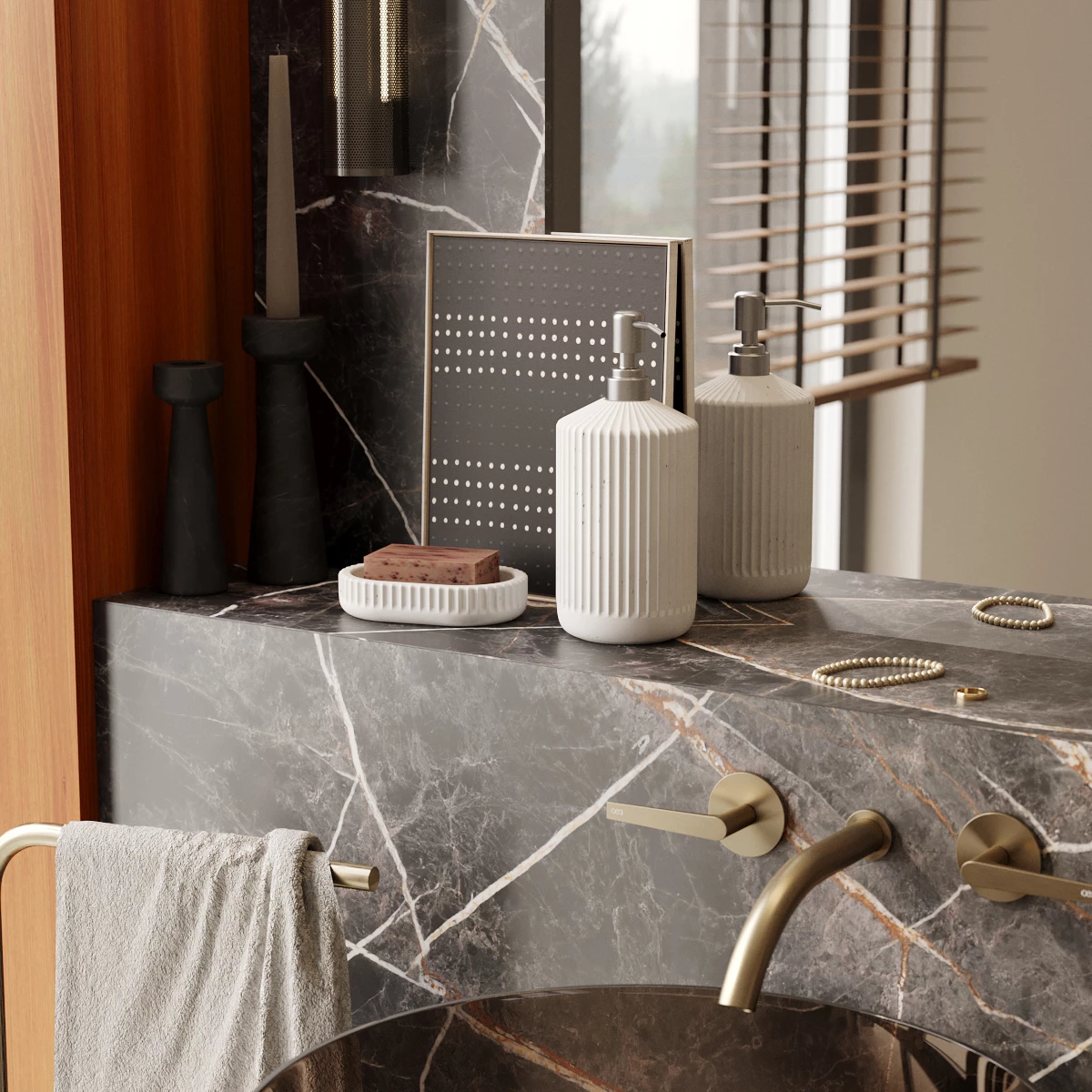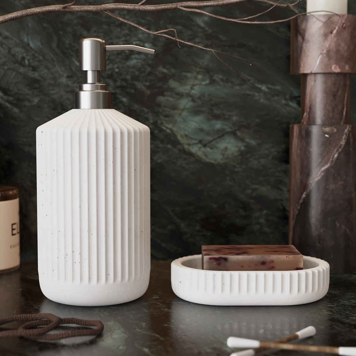 Состав набора: дозатор Chloe, 0,4 л, с корпусом из бетона и металлической помпой | мыльница Chloe, 8,5x13 см.