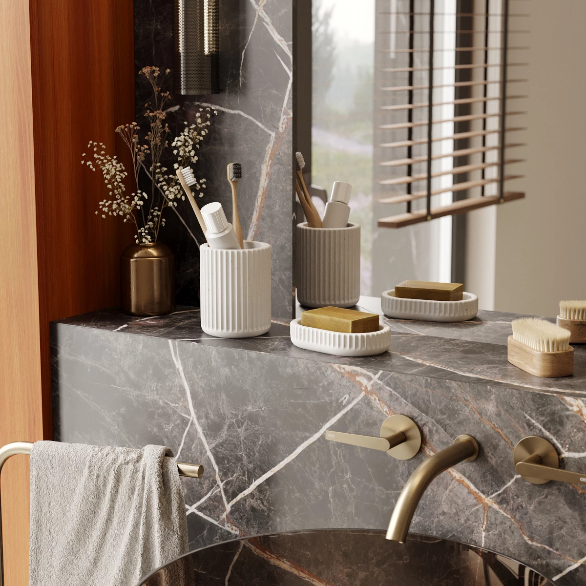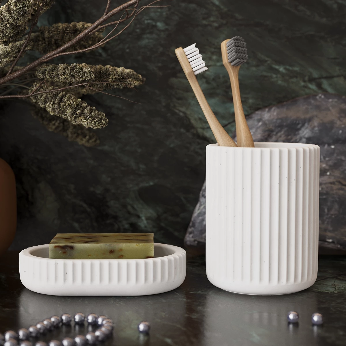 Набор для ванной комнаты отлично подойдет в качестве подарка. Лаконичный дизайн бетонных изделий позволяет им идеально вписаться в любой интерьер.