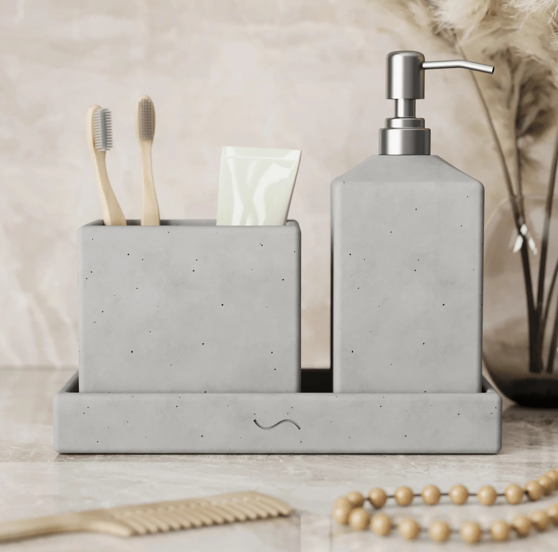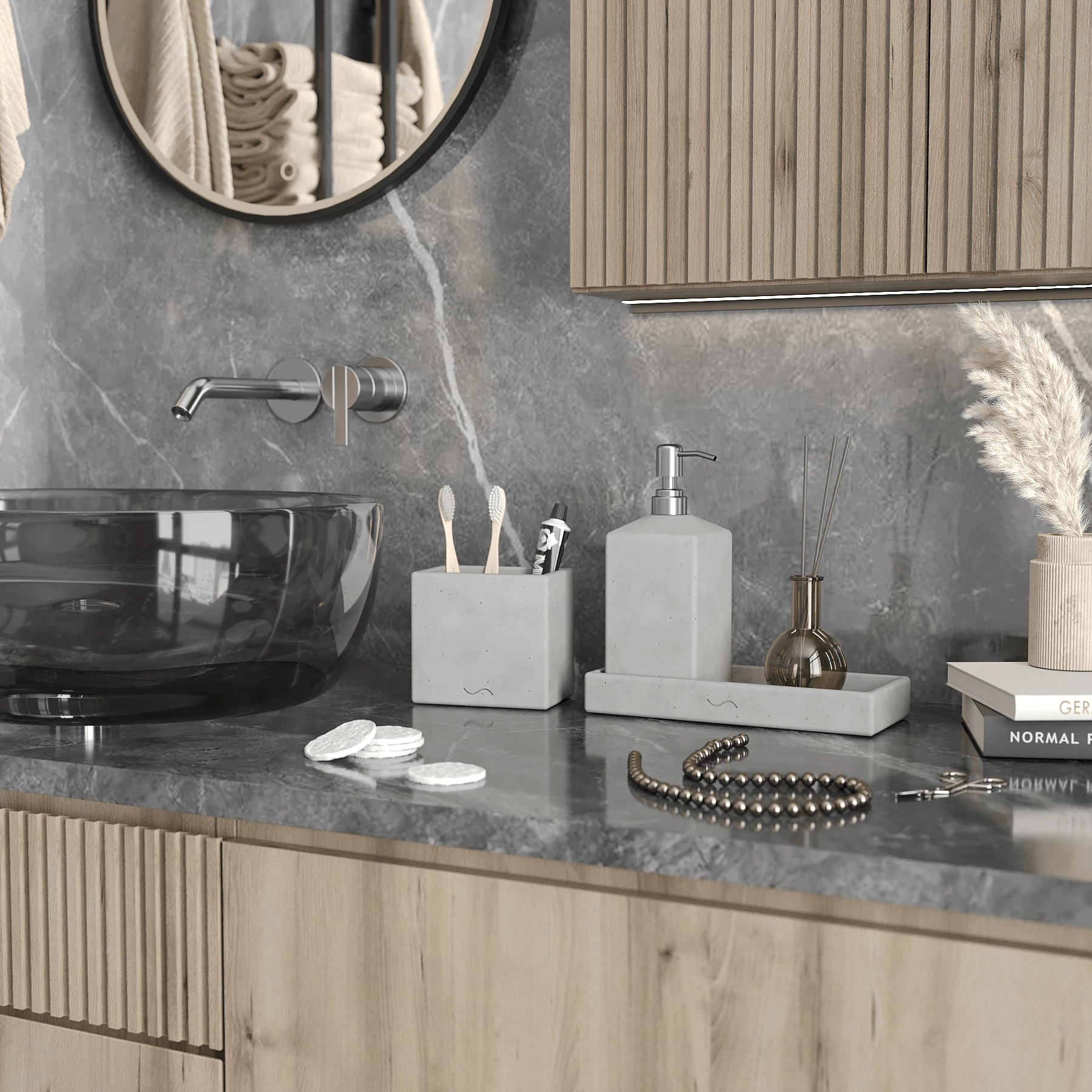 К каждому изделию в наборе прилагаются самоклеящиеся фетровые и силиконовые накладки. Набор для ванной комнаты отлично подойдет в качестве подарка. Лаконичный дизайн бетонных изделий позволяет им идеально вписаться в любой интерьер.