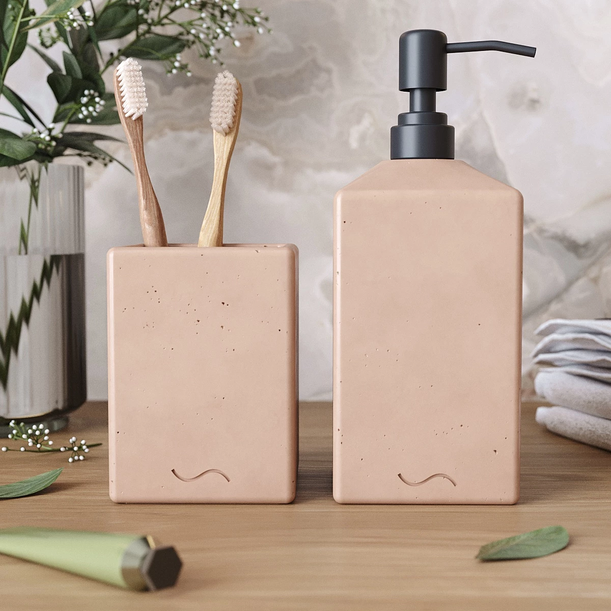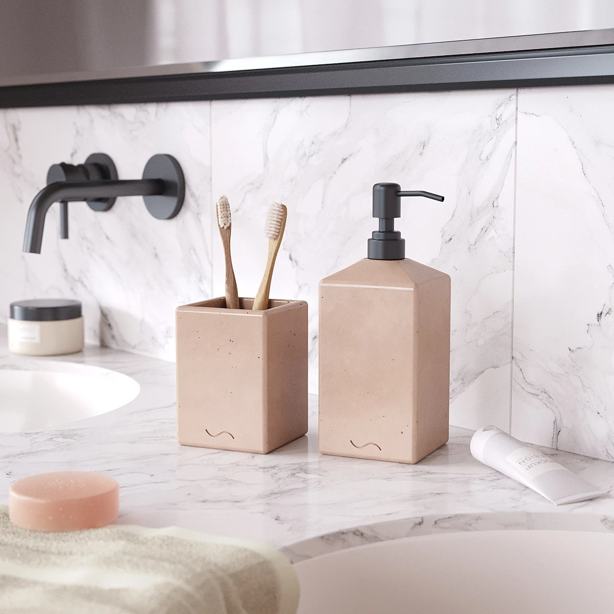 Лаконичный и стильный набор аксессуаров для ванной комнаты, изготовленный вручную из архитектурного бетона. Стакан для зубных щеток и дозатор для мыла станут украшением вашей ванной и помогут организовать пространство.