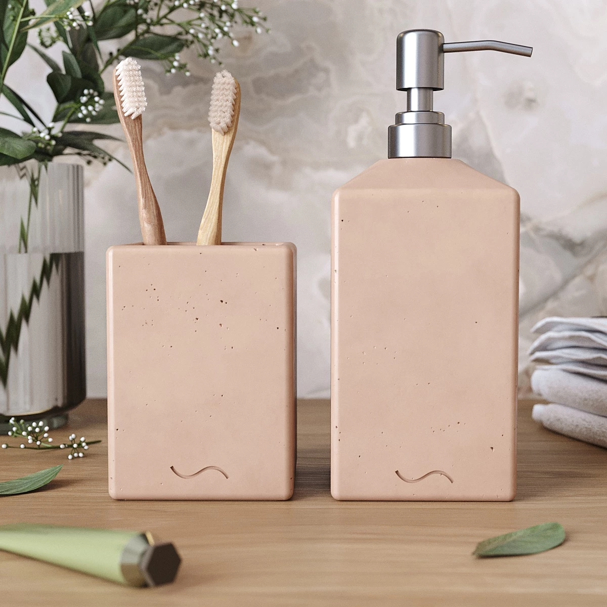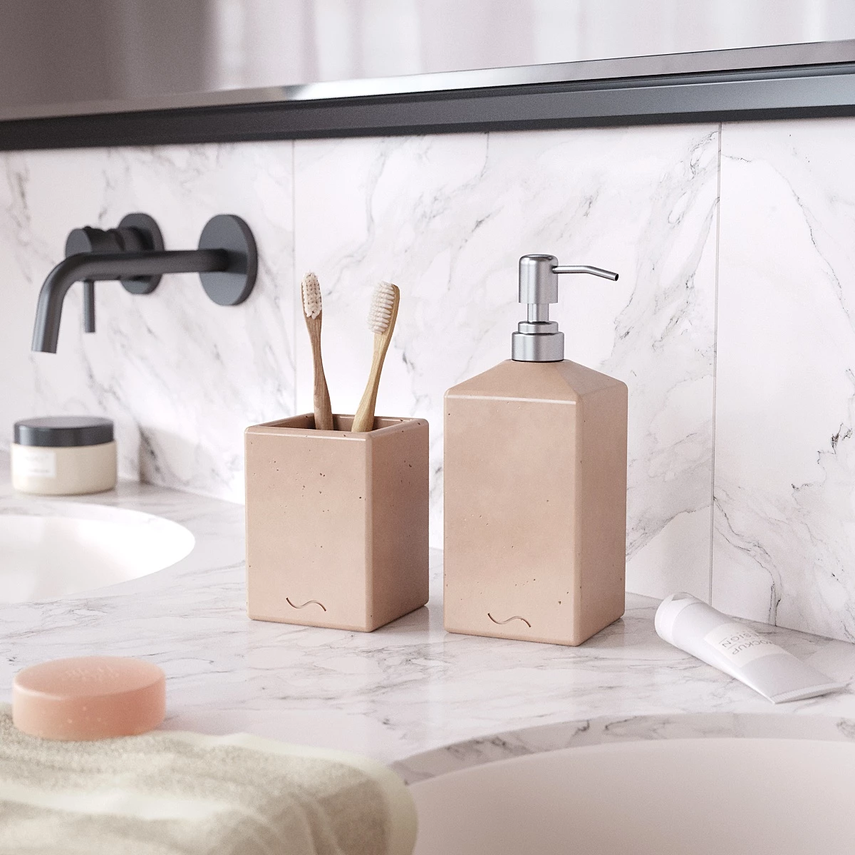 Лаконичный и стильный набор аксессуаров для ванной комнаты, изготовленный вручную из архитектурного бетона. Стакан для зубных щеток и дозатор для мыла станут украшением вашей ванной и помогут организовать пространство.