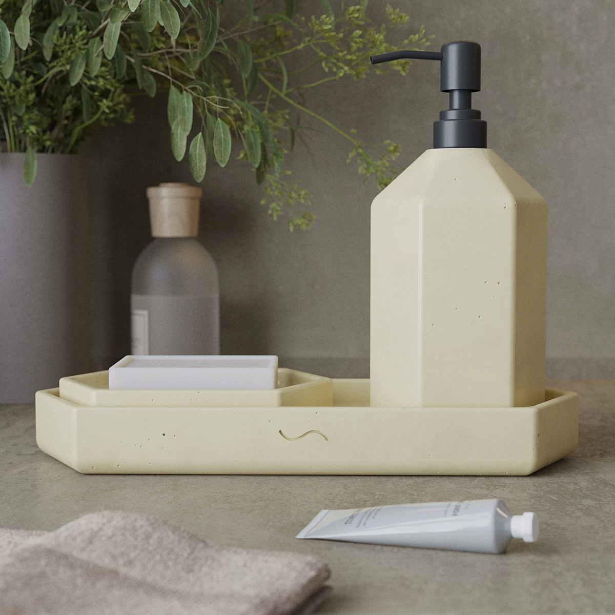 Набор для ванной комнаты отлично подойдет в качестве подарка. Минималистичный дизайн бетонных изделий позволяет им идеально вписаться в любой интерьер.