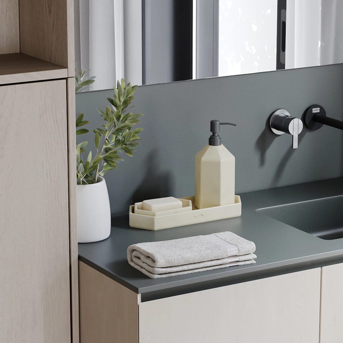 Бетон был выбран нами не случайно. Этот потрясающий натуральный материал способен принимать любую форму и, благодаря особенностям производства, каждая новая партия имеет собственный уникальный оттенок, фактуру, структуру пор и характер.