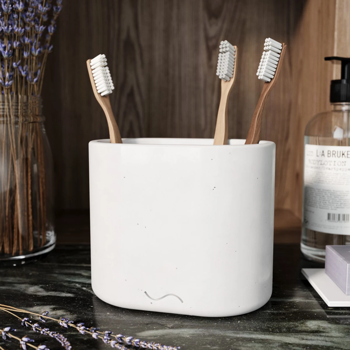 Декоративный двойной стакан для зубных щёток Astrid Duo — это лаконичный и стильный интерьерный аксессуар, изготовленный вручную из архитектурного бетона.