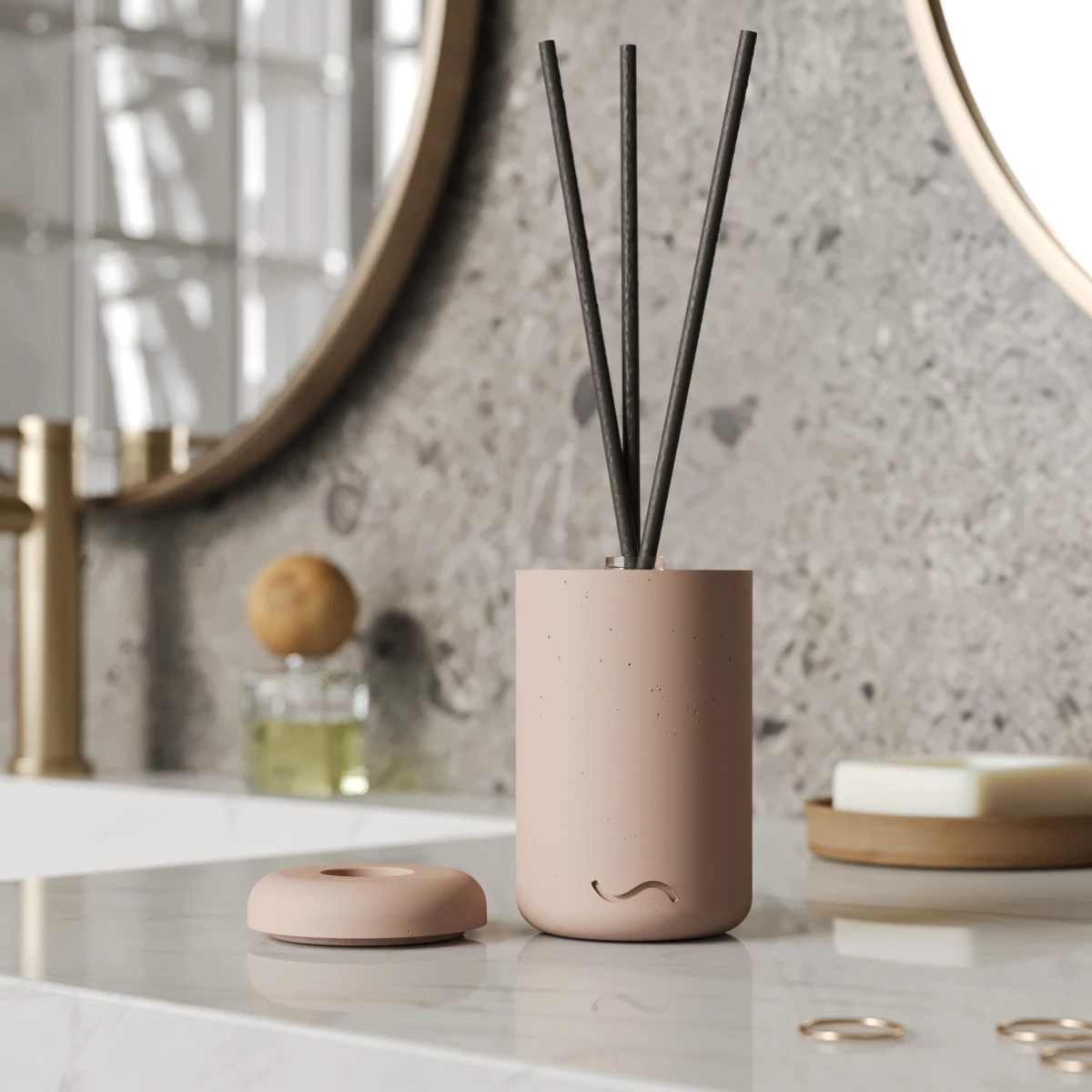 Ароматический диффузор для дома в бетонной вазе - изысканный и функциональный предмет декора. Флакон-рефил легко помещается внутрь бетонной подставки, которая станет украшением любого интерьера, наполняя помещение (будь то ванная, гостиная или спальня) приятным ароматом и создавая особую атмосферу.
