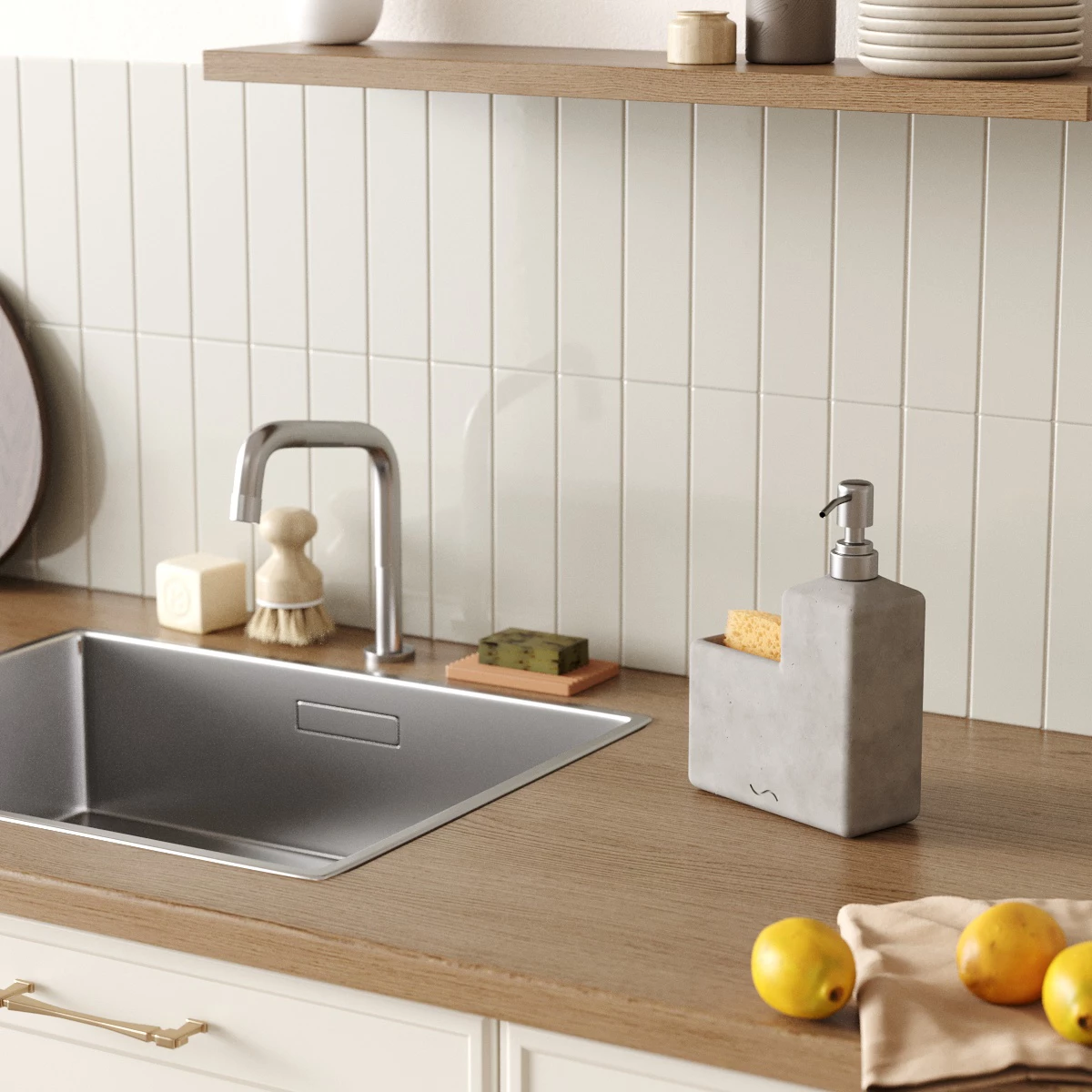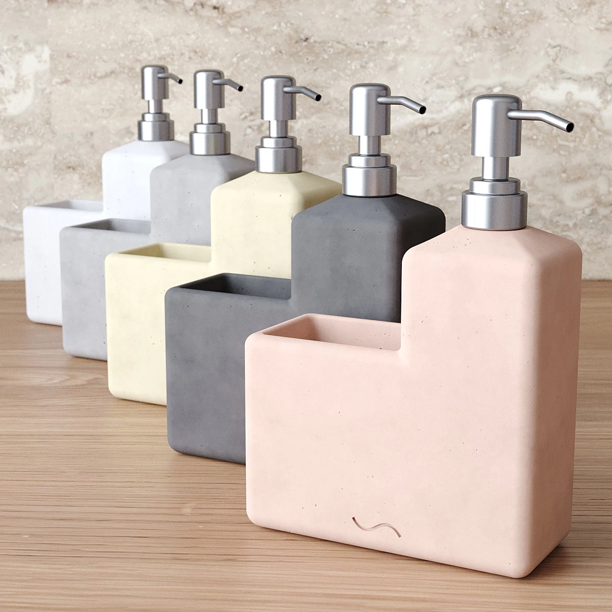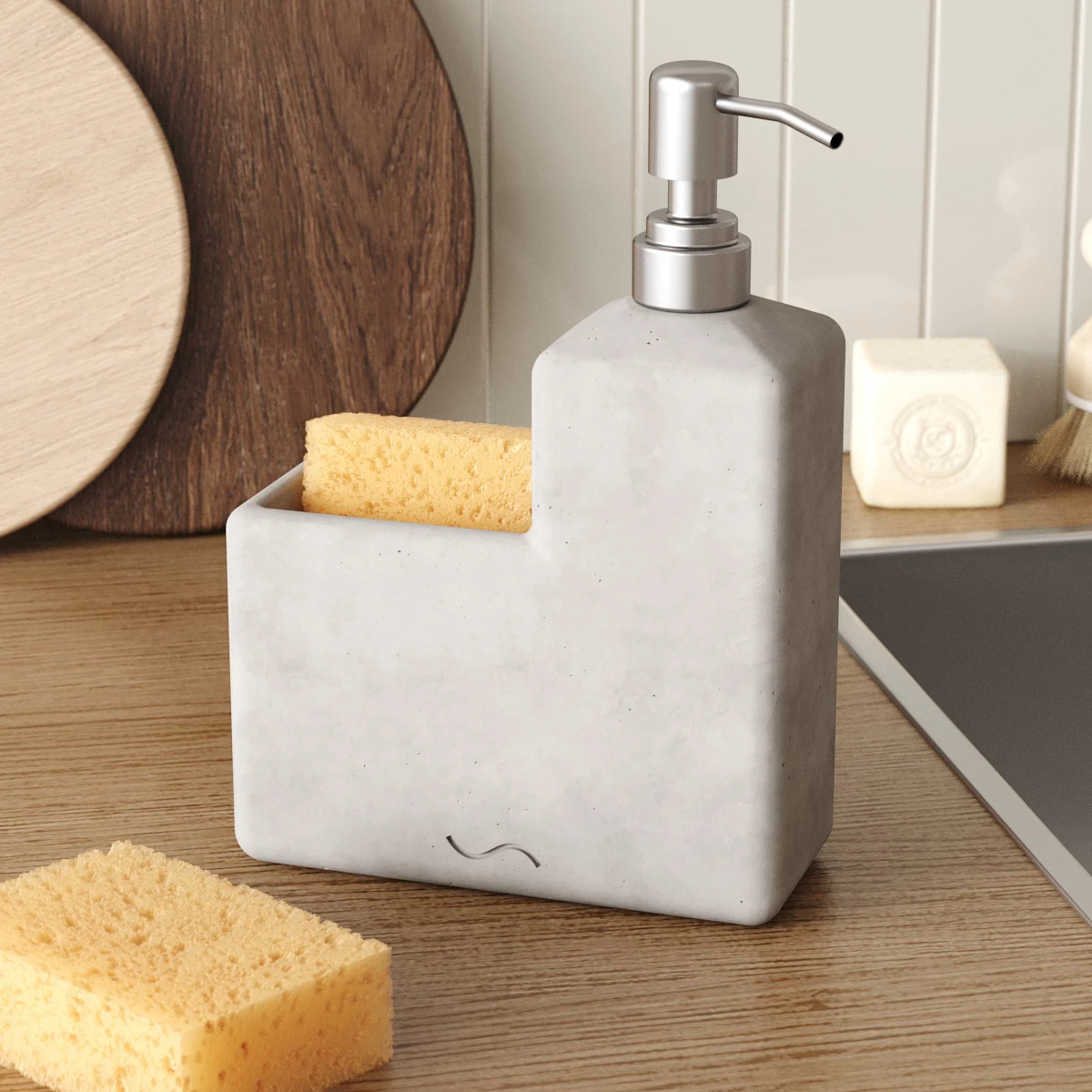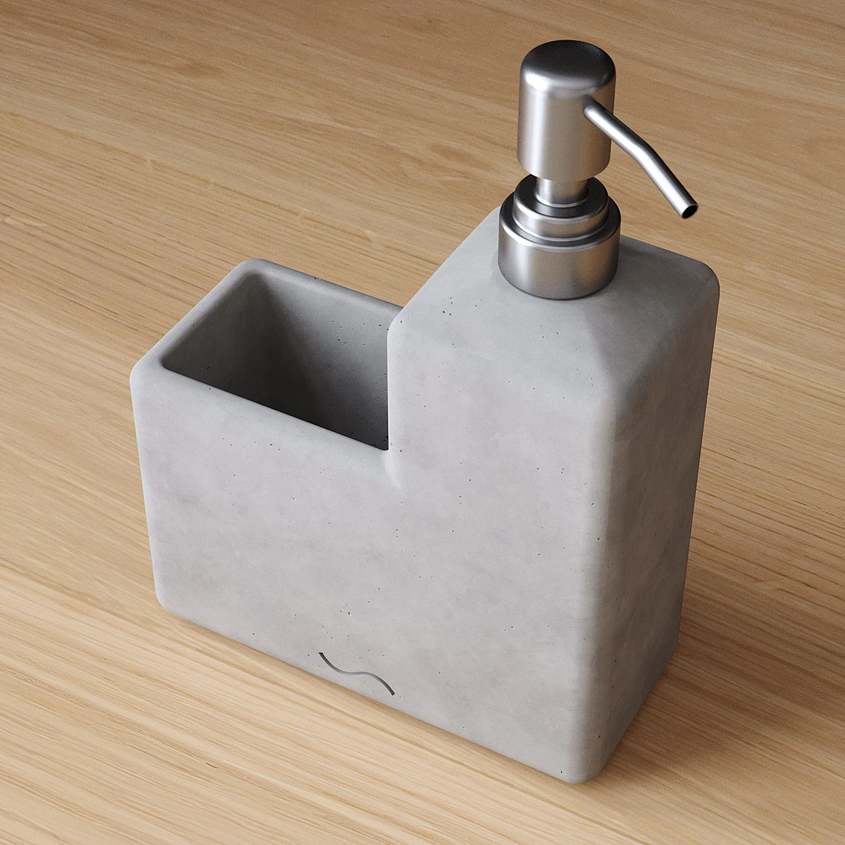 Корпус дозатора-стакана изготовлен из декоративного бетона, а помпа - из металла. Внутри дозатора находится емкость из прочного пластика.
