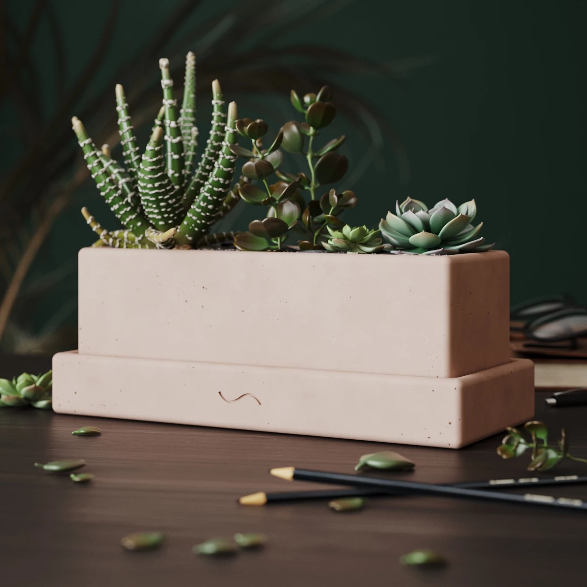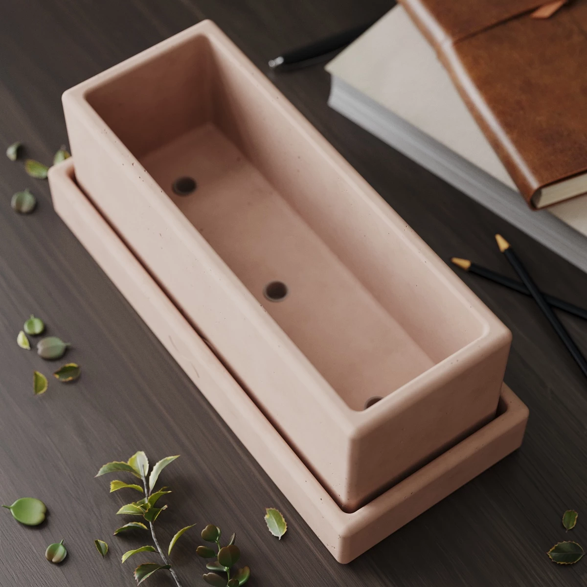 Emily XL c поддоном - декоративный прямоугольный горшок для цветов, объёмом 0,8 л, изготовленный вручную из архитектурного бетона. Горшок обработан матовой пропиткой, которая сохраняет природную текстуру бетона и защищает изделие от воды и грязи. В изделии есть три дренажных отверстия. В комплекте идут специальные пробки, если Вы захотите использовать горшок в качестве кашпо. За счёт лаконичного дизайна Emily XL идеально впишется в любой интерьер - от классического до современных минималистичных стилей (сканди, лофт). К изделию прилагаются самоклеящиеся накладки, предназначенные для защиты поверхностей.