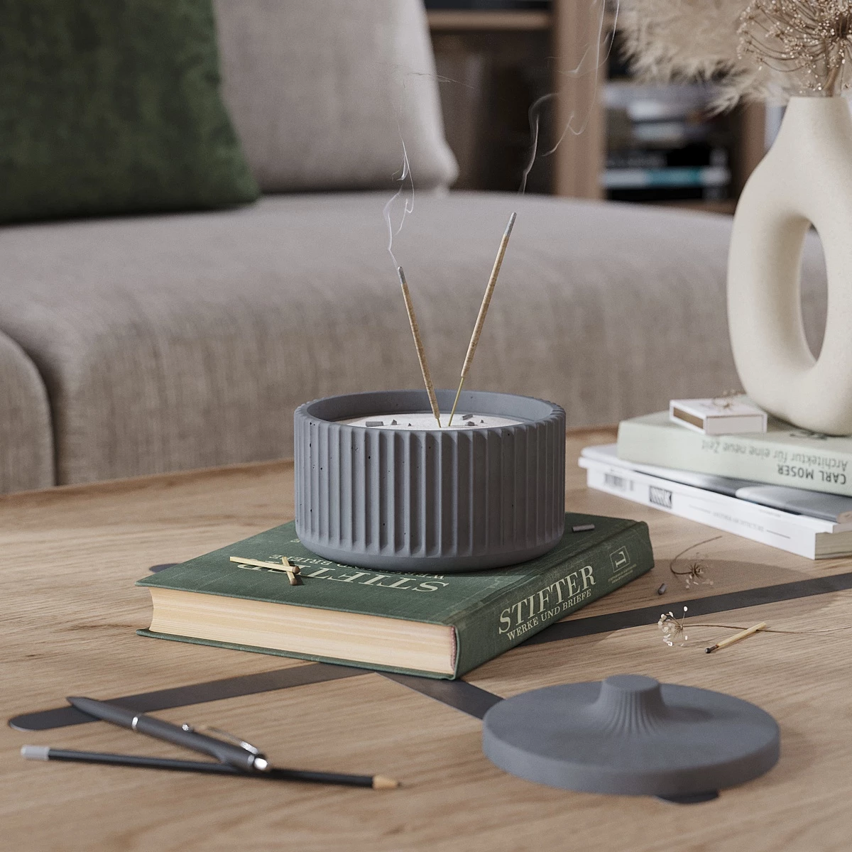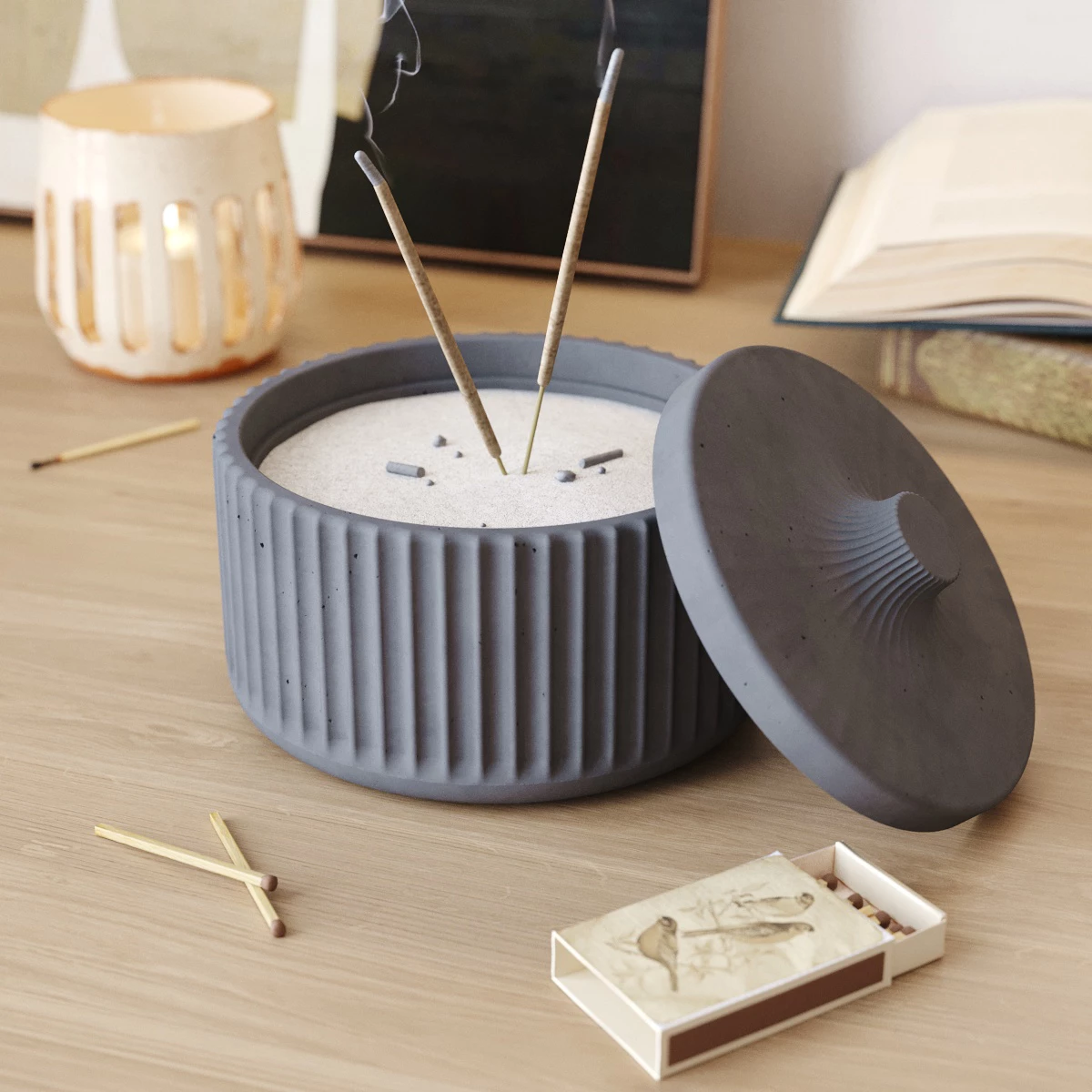 Chloe M - декоративная емкость с крышкой для благовоний, изготовленная вручную из особо прочного бетона. В набор также входит мраморный песочек.