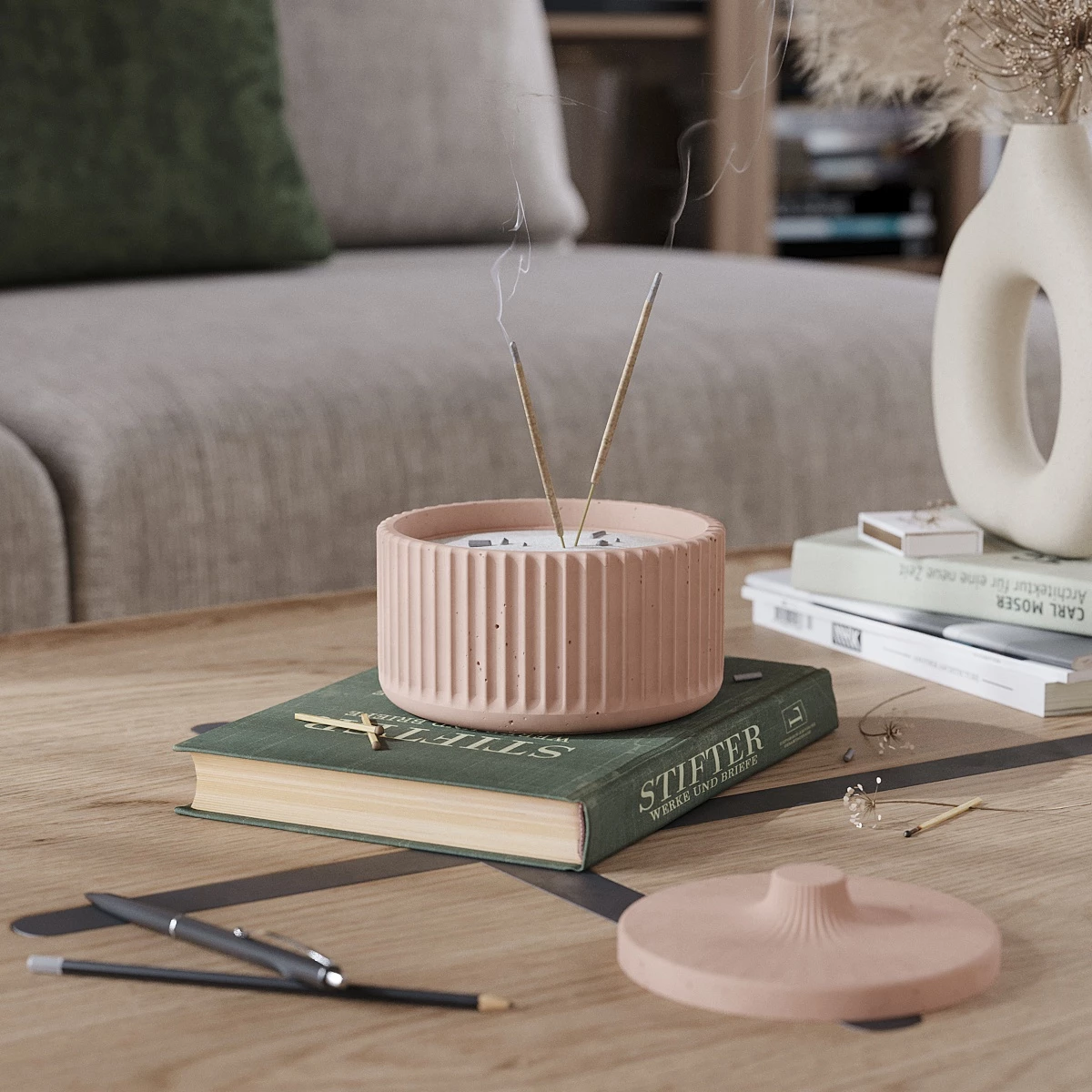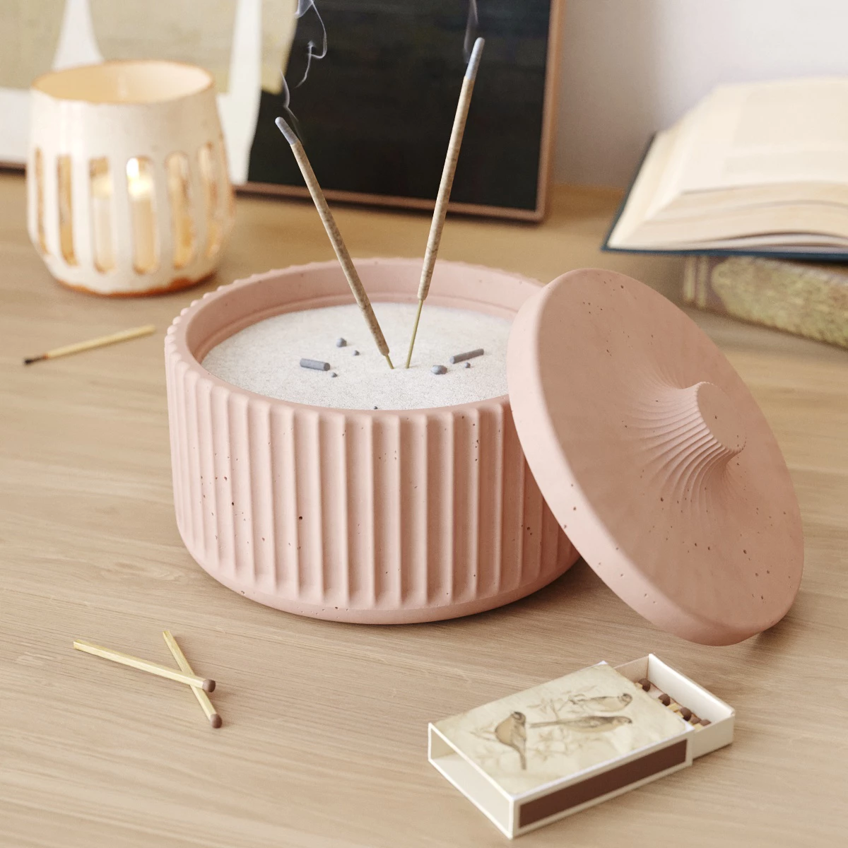 Chloe M - декоративная емкость с крышкой для благовоний, изготовленная вручную из особо прочного бетона. В набор также входит мраморный песочек.