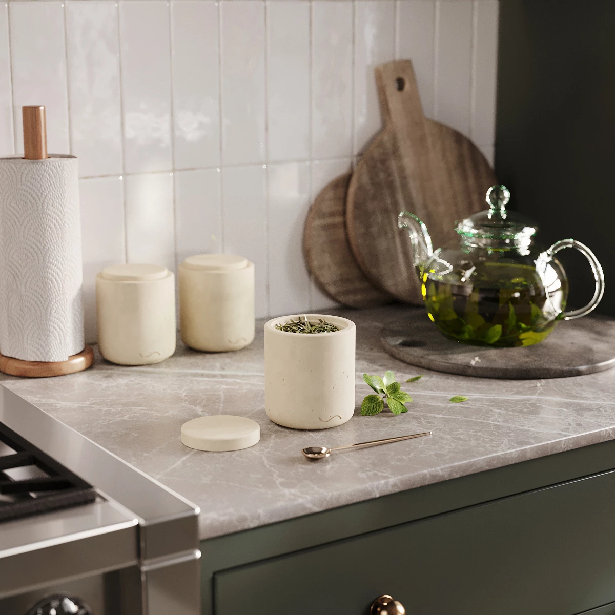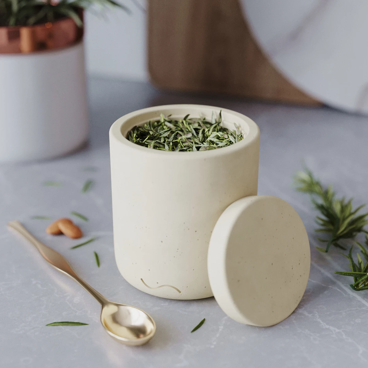 Astrid S - декоративная емкость с крышкой для хранения сыпучих продуктов, изготовленная вручную из особо прочного бетона.