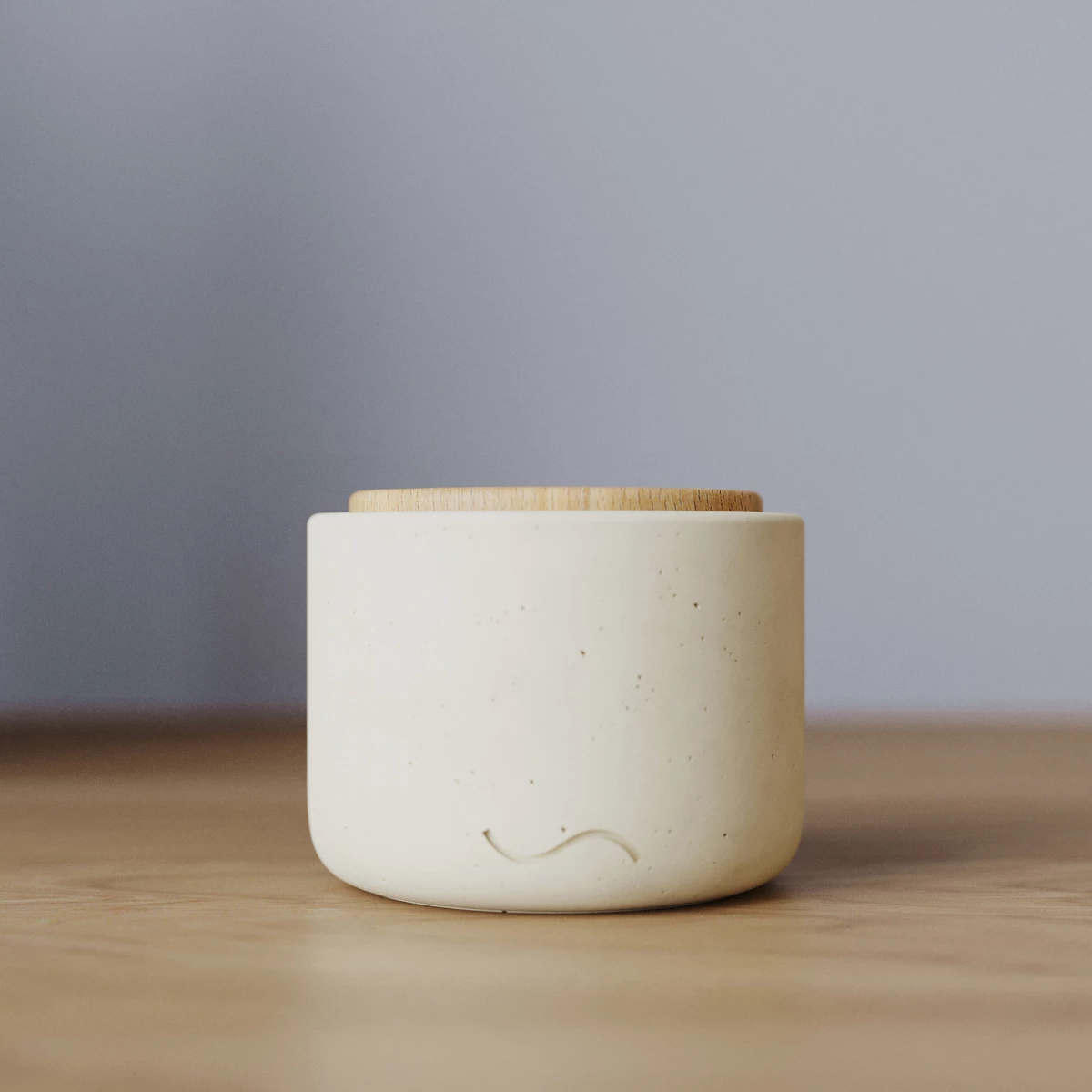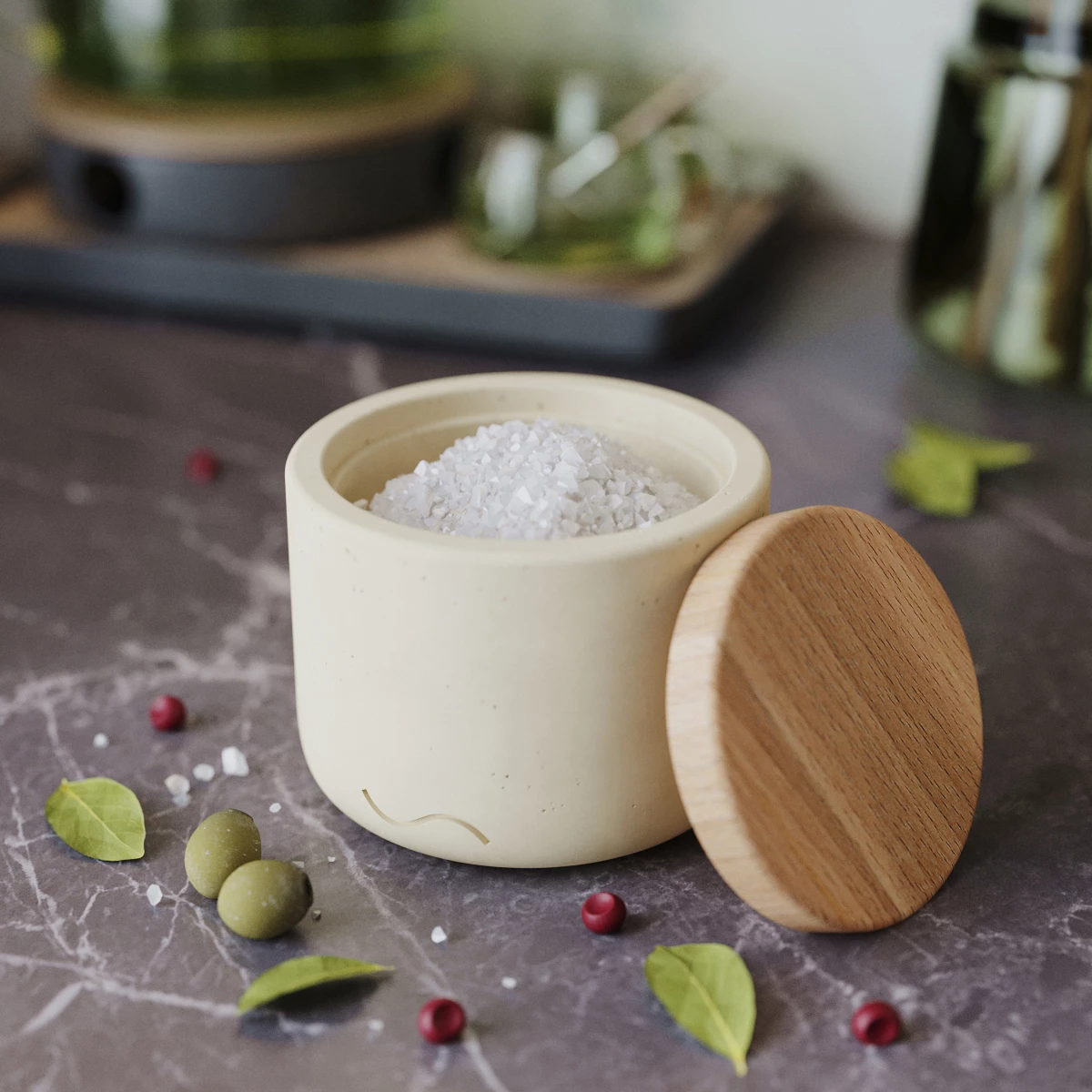 Astrid XS - декоративная емкость из особо прочного бетона с крышкой из натурального бука для хранения сыпучих продуктов, изготовленная вручную.