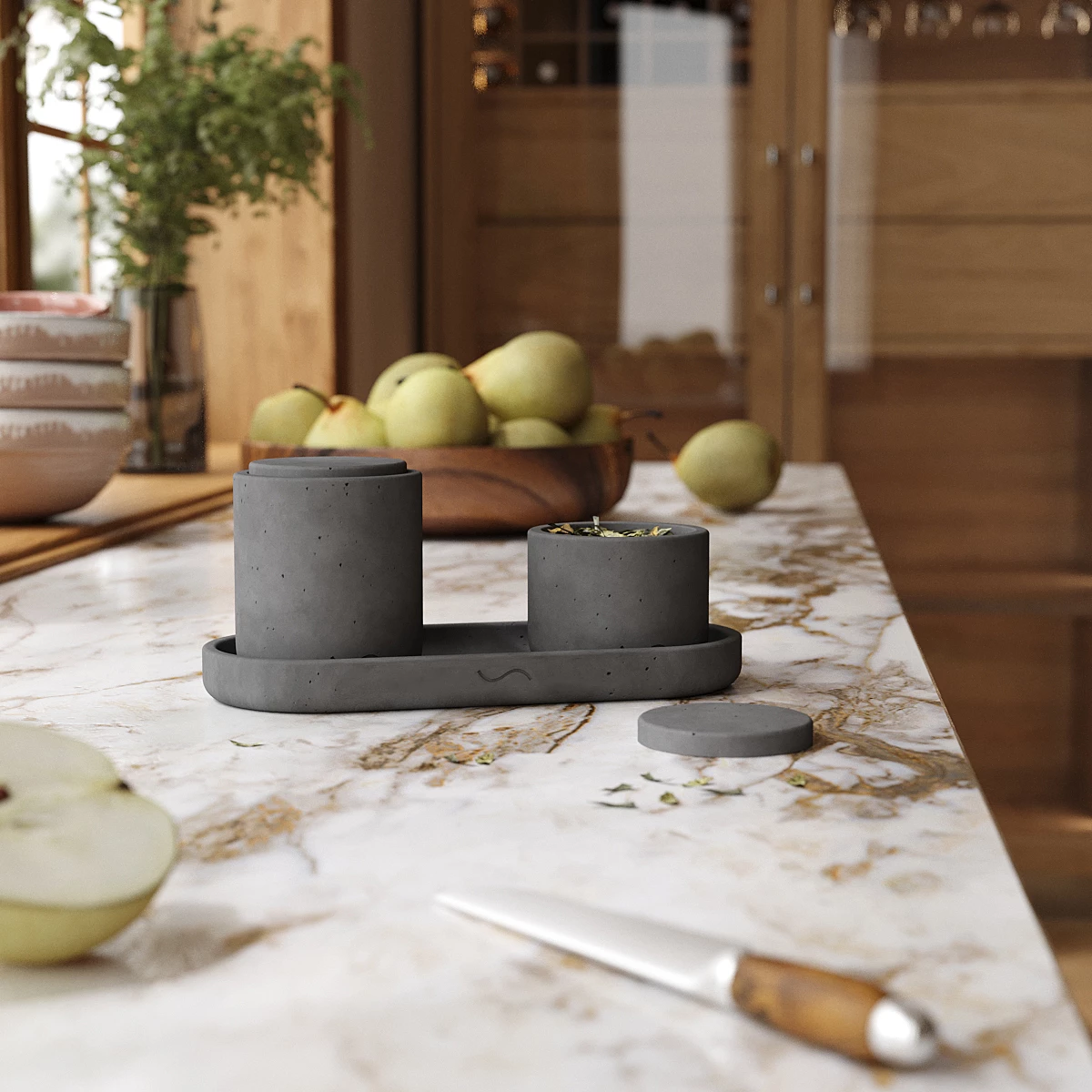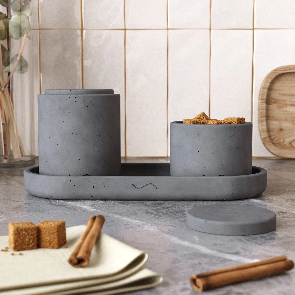 Лаконичный и стильный набор аксессуаров для кухни, изготовленный вручную из архитектурного бетона. Поднос и две банки с крышками для хранения сахара, специй и прочих сухих сыпучих продуктов станут украшением вашей кухни и помогут организовать пространство.