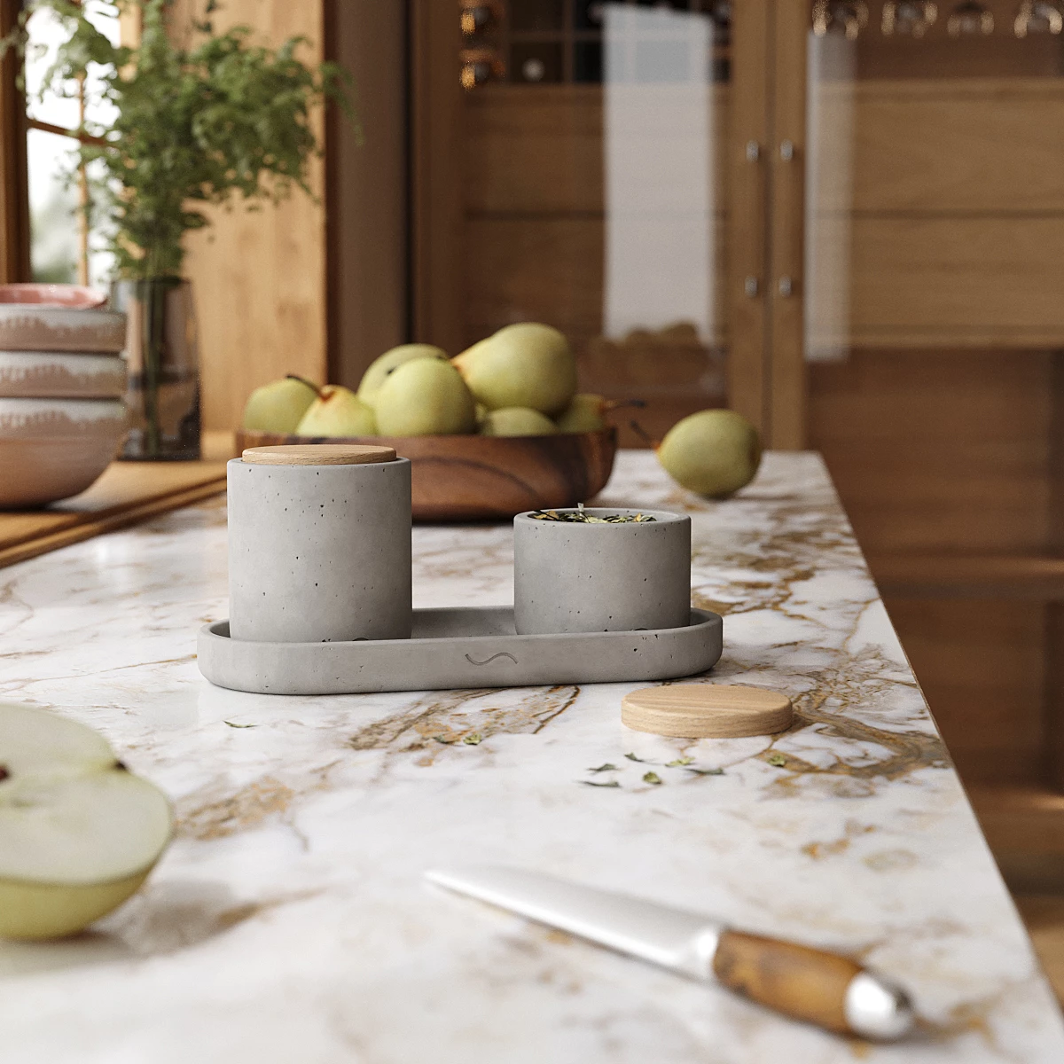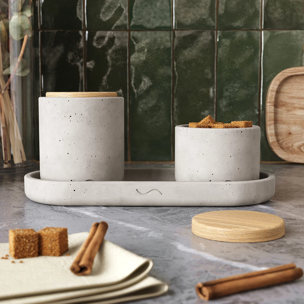 Лаконичный и стильный набор аксессуаров для кухни, изготовленный вручную из архитектурного бетона. Поднос и две банки с крышками для хранения сахара, специй и прочих сухих сыпучих продуктов станут украшением вашей кухни и помогут организовать пространство.