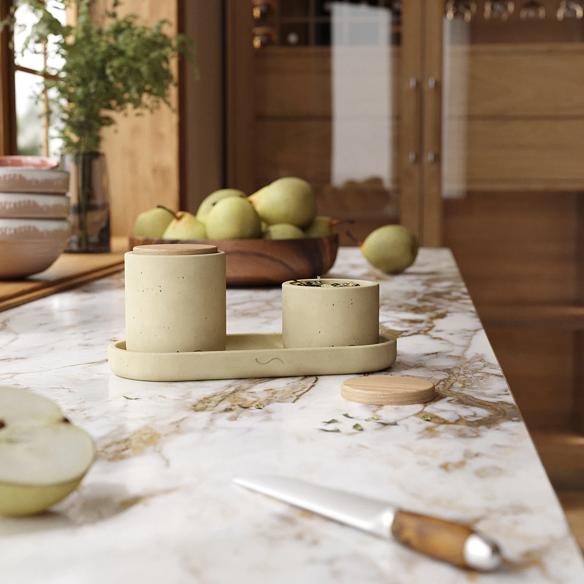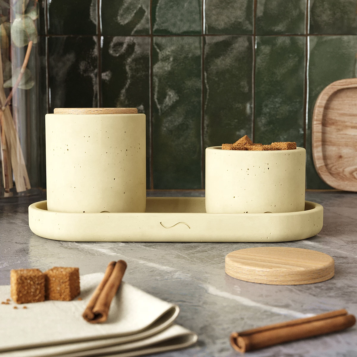 Лаконичный и стильный набор аксессуаров для кухни, изготовленный вручную из архитектурного бетона. Поднос и две банки с крышками для хранения сахара, специй и прочих сухих сыпучих продуктов станут украшением вашей кухни и помогут организовать пространство.